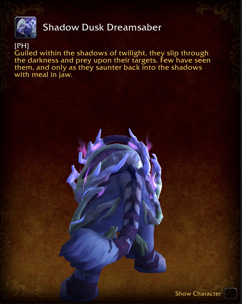 Players who complete the Glory of the Dream Raider Glory of the Dream Raider mount in Patch 10.2 will receive the Reins of the Shadow Dusk Dreamsaber Reins of the Shadow Dusk Dreamsaber mount.