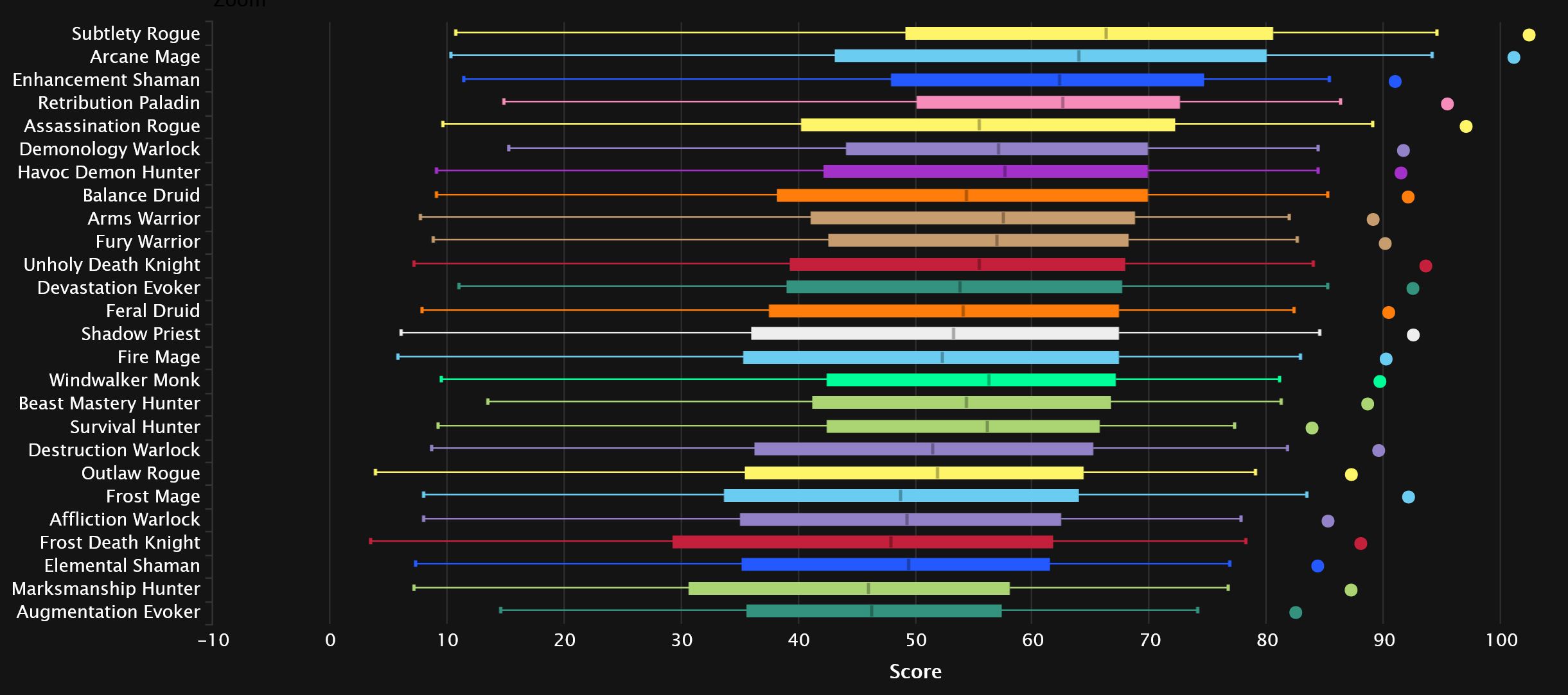 The below logs are based on POINTS, and not actual damage or healing, meaning they log the timed completion for the specs, with higher keys getting more points, obviously. The time in which the dungeon is completed is also a factor, but a much, much smaller one, as it grants very few points if you do it significantly faster than just any in-time completion. We're also using the Normalized Aggregate Scores numbers, for clarity, meaning the top spec is marked as 100 and then the rest are ranked in relation to that peak point.