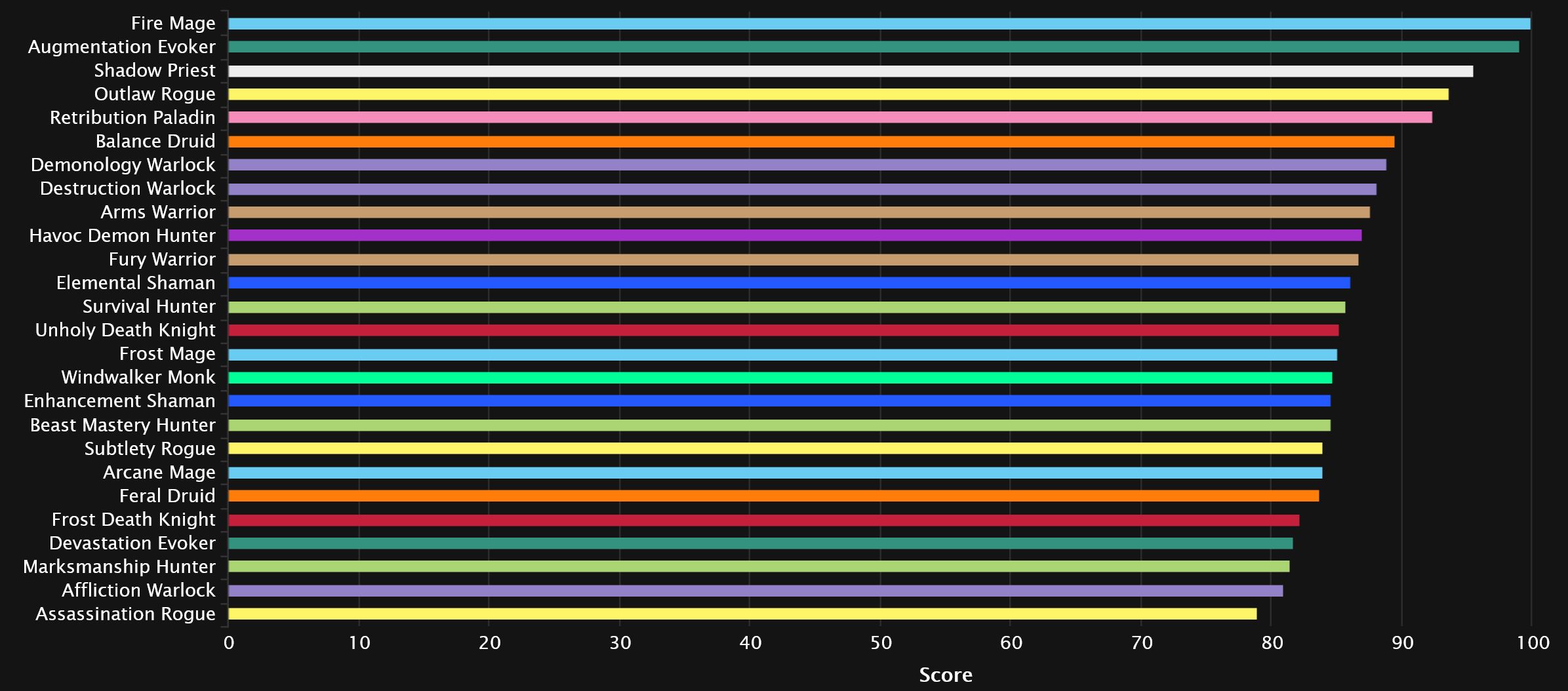 We actually see Augmentation move up a little here in the generalist bracket, but not enough to dethrone Fire. Meanwhile, Balance drops off quite a bit, losing 3 spots and going down to 9th, opening things up for Demonology, Havoc and Arms, with the last two switching spots and the DH coming out on top. Some good news for Hunters here as both Beast Mastery and Survival move past Fury in 10th and 11th, as the Warrior loses out to Windwalker as well.