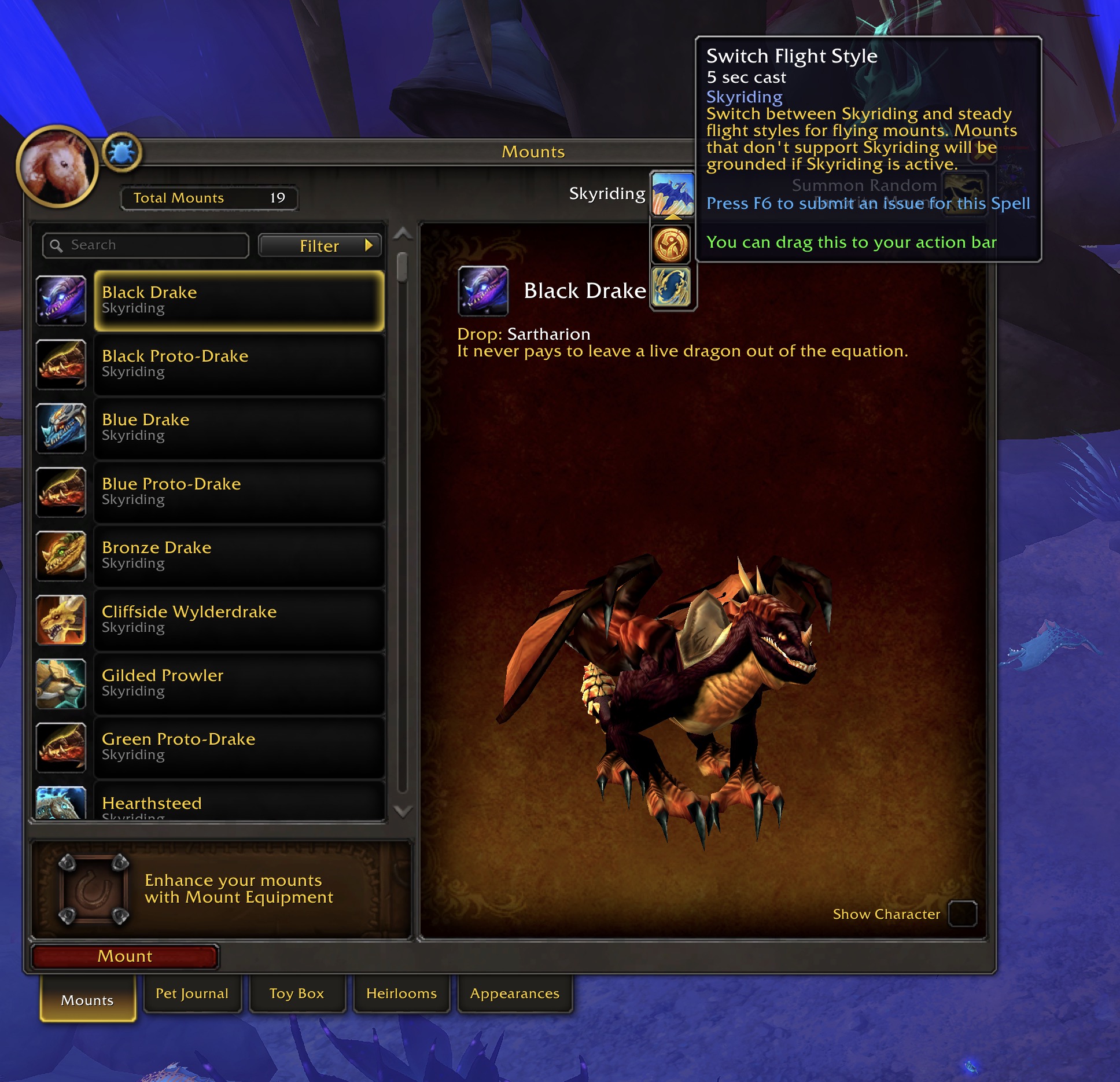 In the Mounts Tab, the Switch Flight Style button lets you seamlessly switch between Skyriding and regular flying.
