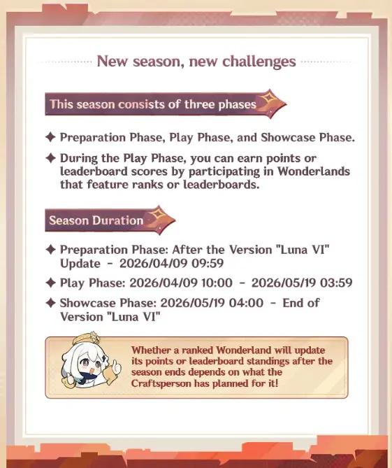 - A short preparation phase after the Luna VI update until April 09, 2026.