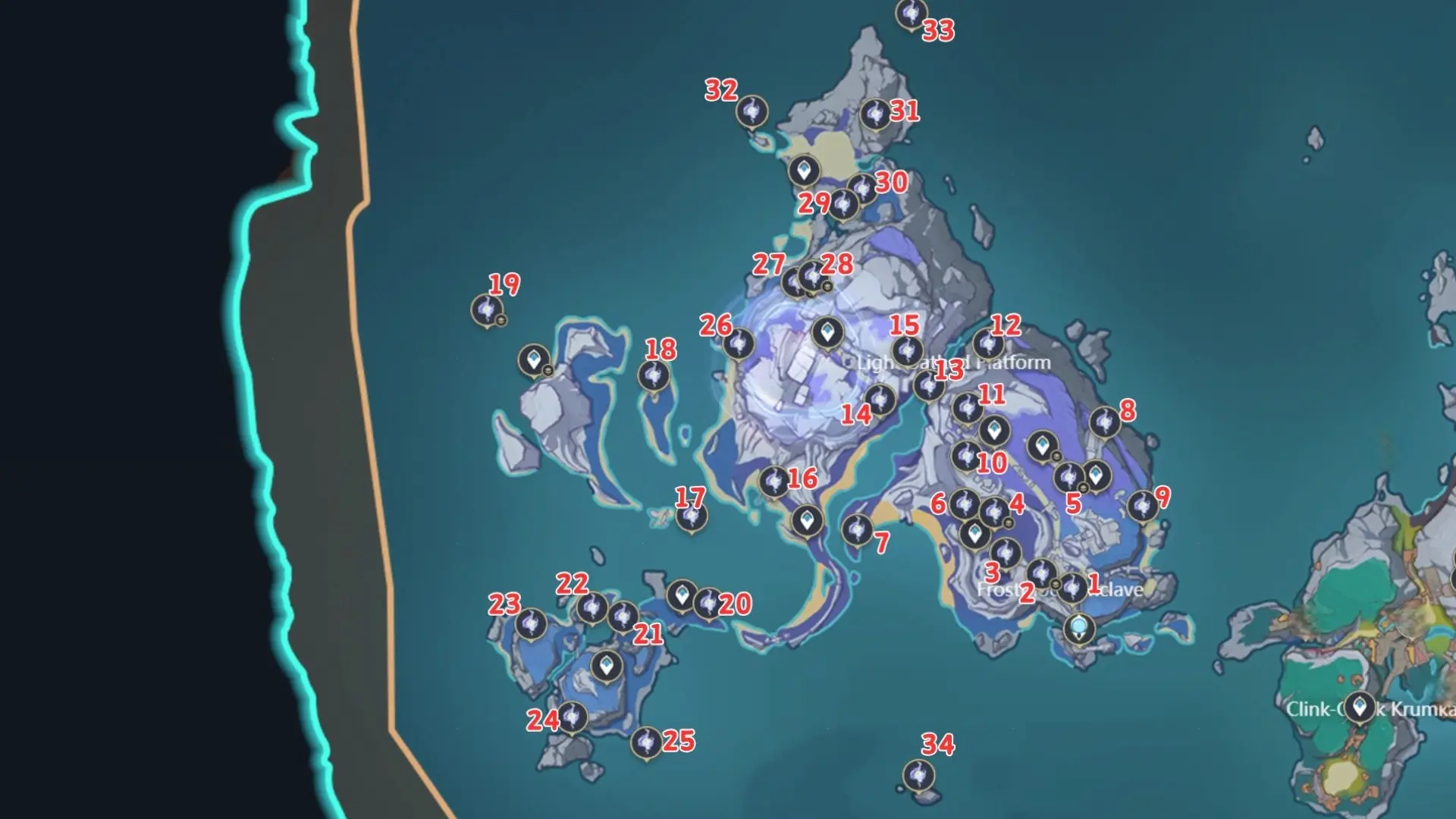 #34 On the very small little island bit in the water all the way down. If you do not have a character that can easily reach it (either Furina or with Freeze), take the Khuvaaki express (the shiny line) from on the other side. It will lead you to it