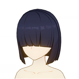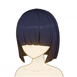 A dark cerulean colored short hairstyle. The curtain bangs are long enough to cover the eyes, ideal for those who dread direct eye contact.