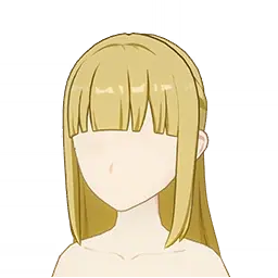A long, golden hairstyle. The tidy strands rest in a natural curl, giving the impression of a quiet and reserved character.