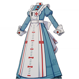 An outfit combining a pristine white apron with a soothing blue dress beneath. Designed for comfort and practicality, it allows ease of movement and is easy to clean or replace. The red scale-like markings along the apron serve as a quiet reminder to face each patient with composure, care, and precision.