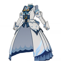 Frosty Plume Formals is a 5-Star (Orange) rarity item available in Genshin Impact's Miliastra Wonderland UGC gamemode, designed for the upper body slot. Frosty Plume Formals can only be equipped by the female Manekina. This variant mainly features colors such as Blue and White.