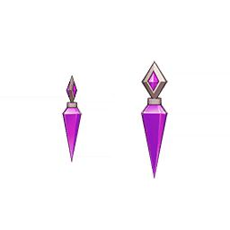 Scaleblade Chronicles Earrings: Dark Flame is a 5-Star (Orange) rarity item available in Genshin Impact's Miliastra Wonderland UGC gamemode, designed for the earrings slot. Scaleblade Chronicles Earrings: Dark Flame can only be equipped by the female Manekina. This customisation option features primarily a purple color scheme.