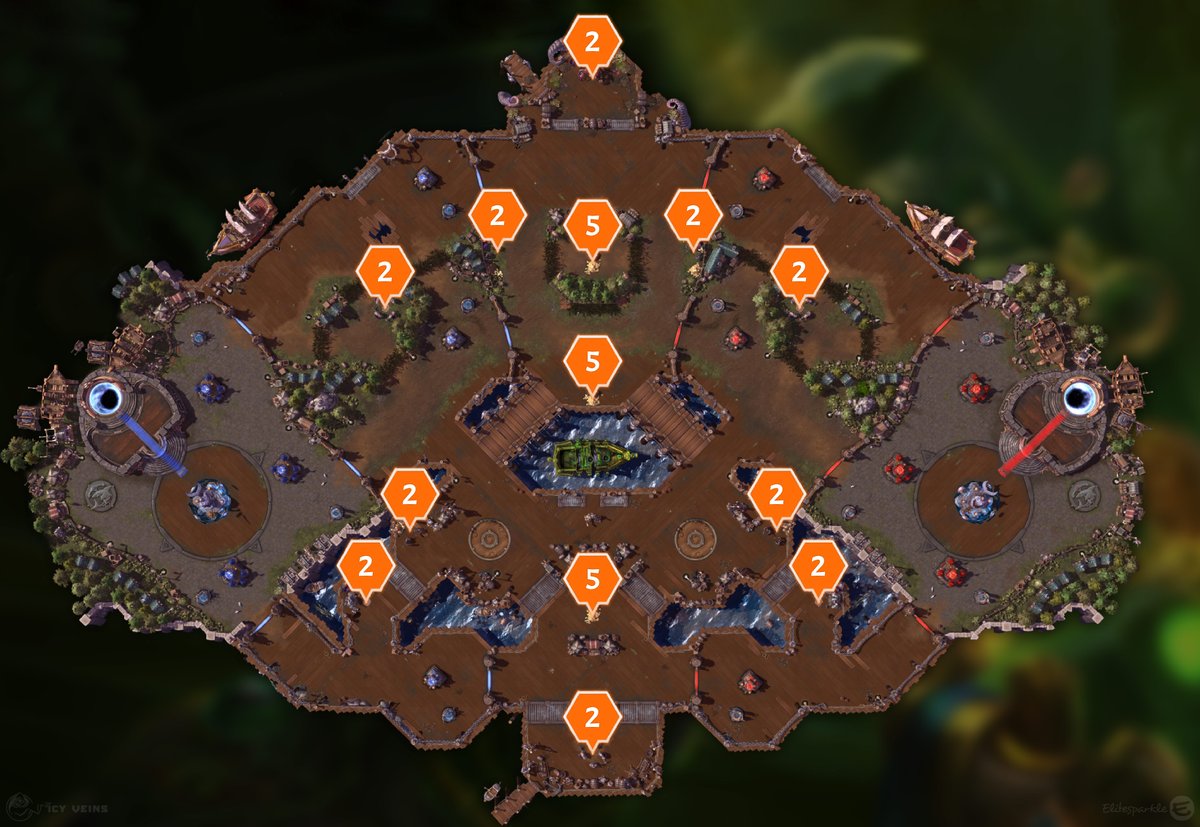 - 2 Doubloon Camps (orange icon) between the middle and the bottom lanes;