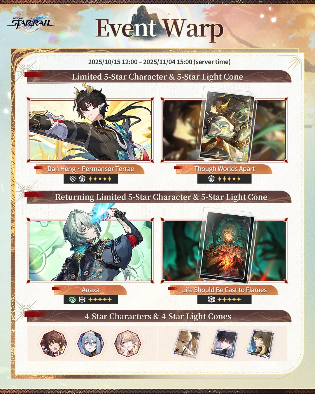 Get ready for the 3.6 Phase 2 event warp as it’s arriving on the 15th October, 2025 until 4th November, 2025! This is an exciting update as we know that 5-Star Dan Heng (Permansor Terrae) will be available for free through the Event Pact of Permansor Terrae while phase 2 is active. Alongside this awaited 5-Star we can also expect to see 5-Star Anaxa and 4-Star Sushang, Hanya and Serval.