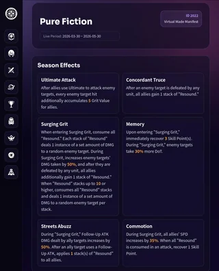“When entering Surging Grit, consume all “Resound”. Each stack of “Resound” deals 1 instance of a set amount of DMG to a random enemy target. During Surging Grit, increases enemy targets’ DMG taken by 50%, and after they are defeated by any unit, all allies additionally gain 1 stack of “Resound.” When “Resound” stacks up to 10 or higher, consumes all “Resound” stacks and deals 1 instance of a set amount of DMG to a random enemy target per stack.”