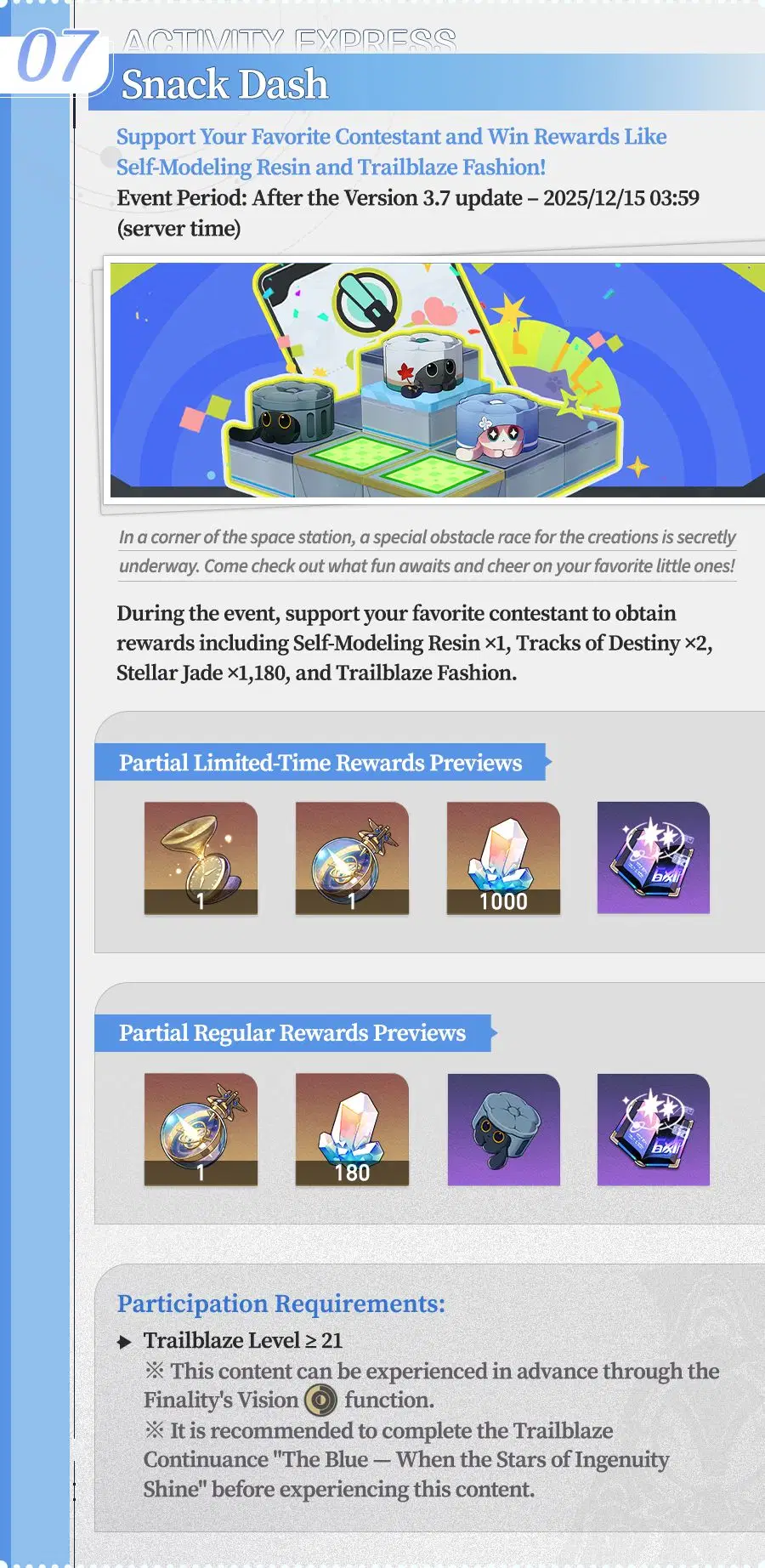 The fun and exciting new event Snack Dash features adorable little critters where you support your favourite contestant with a chance to receive rewards such as Self Modelling Resin, Tracks of Destiny, Stellar Jades and more. This Event will be available from the start of 3.7 until 15th December, 2025 and will require you to be at least Trailblaze Level 21 and above.