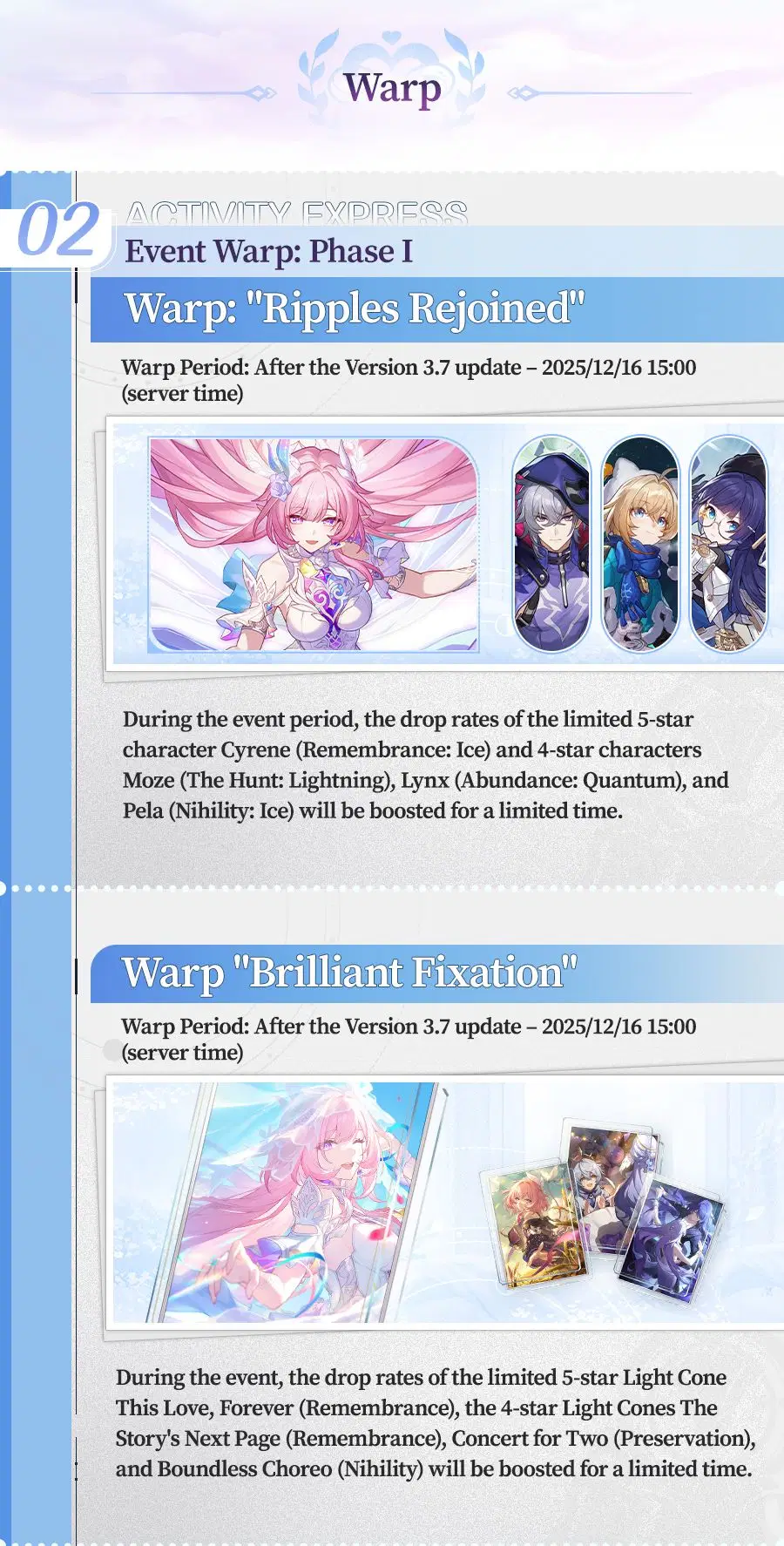 Phase 1 which is available from the start of the 3.7 update will feature the Event Banner “Ripples Rejoined” introducing the new 5-Star character Cyrene. Cyrene follows the Path of Remembrance with the Ice element and will be a Support character within team compositions.