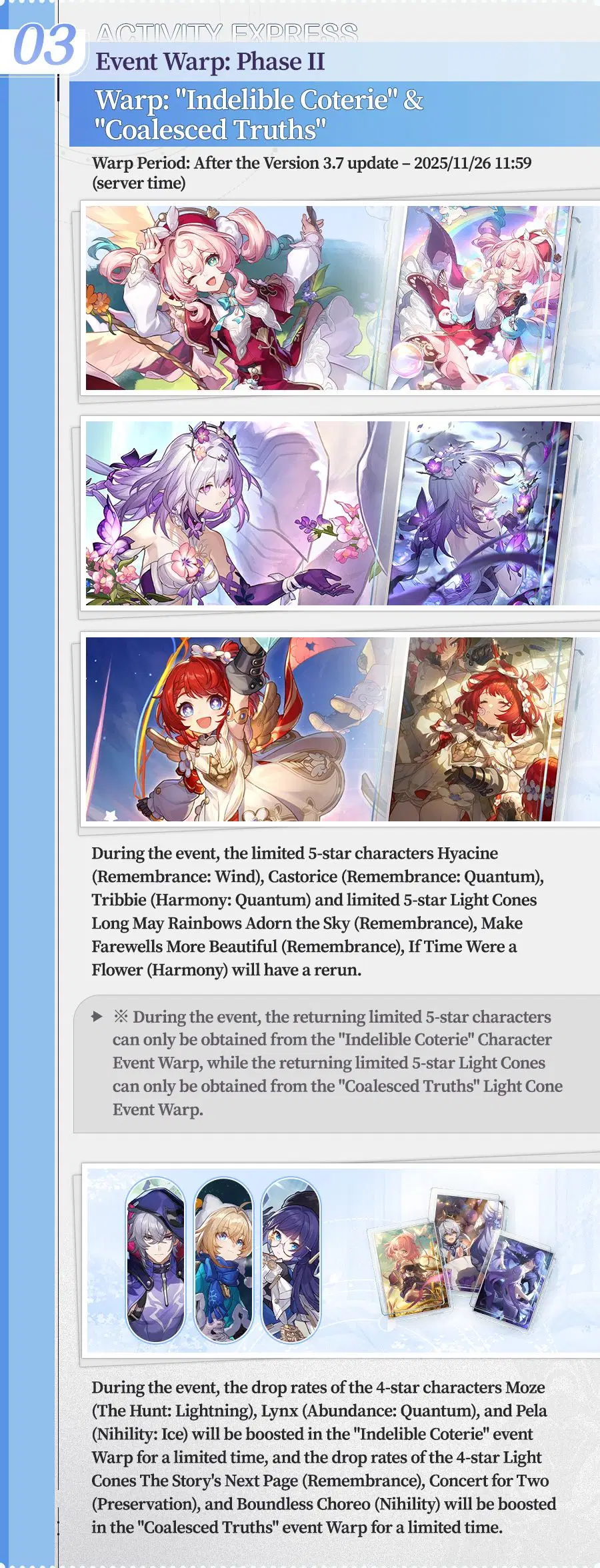 - Phase 2 (Hyacine, Castorice & Tribbie) – 4th November, 2025 – 26th November, 2025
