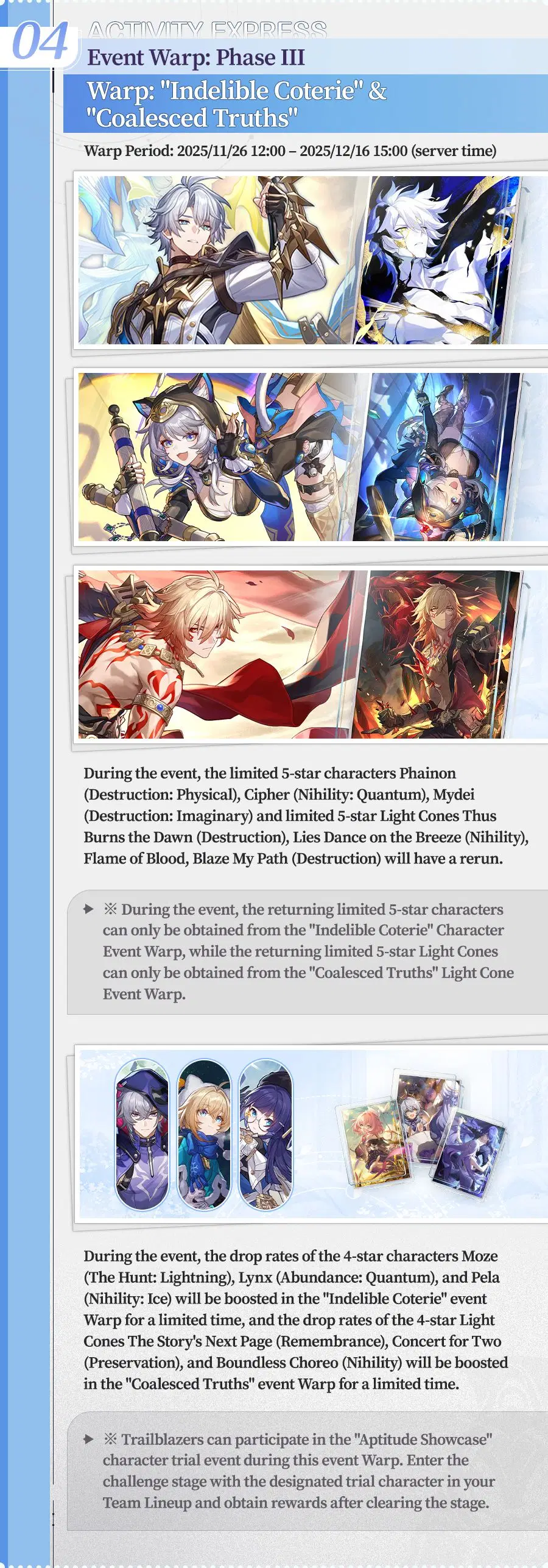 - Phase 3 (Phainon, Cipher & Mydei) – 26th November, 2025 – 16th December, 2025
