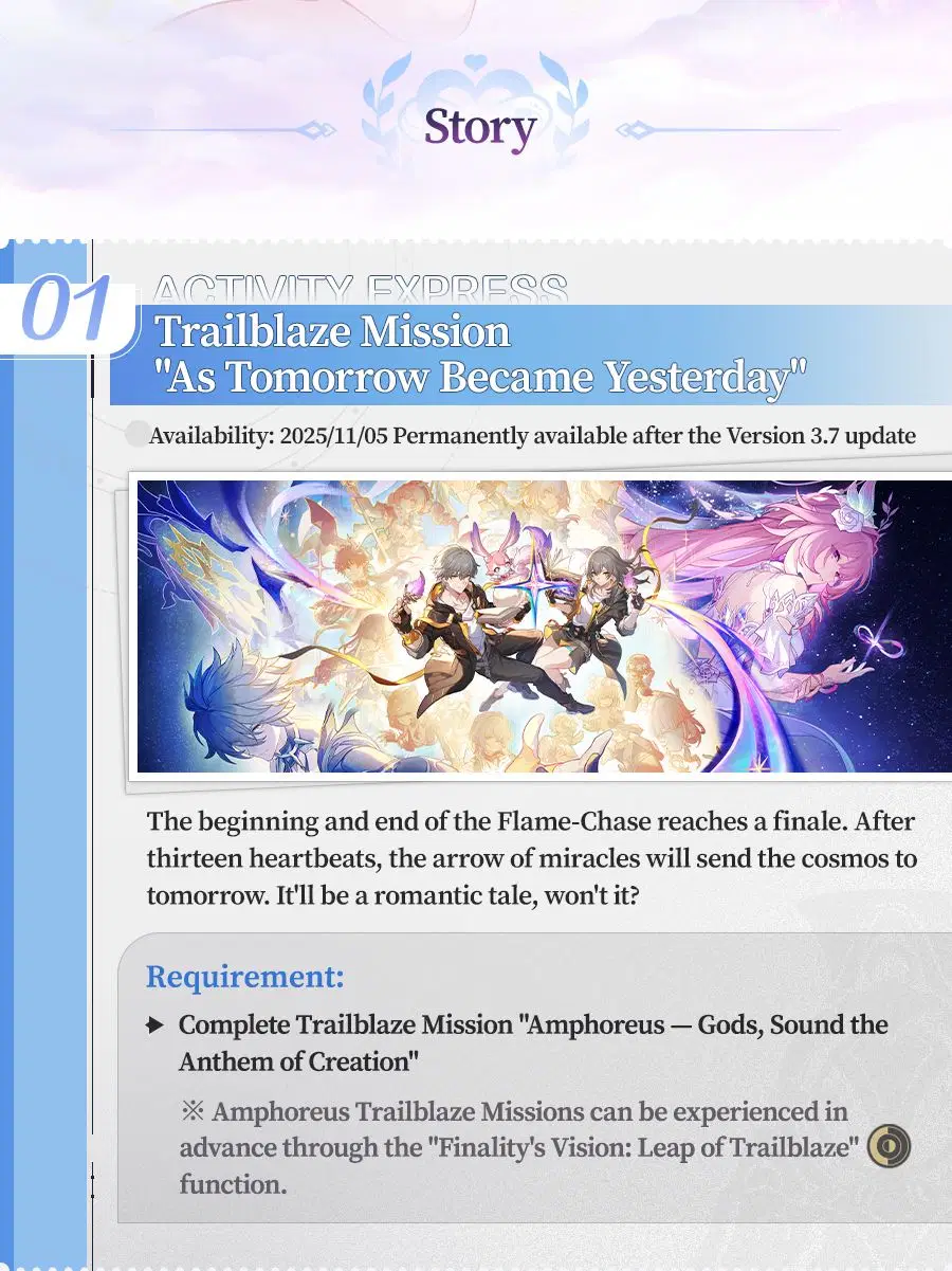 Version 3.7 will feature an exciting new Trailblaze mission continuing the Main Story which will be available from 05 November, 2025 called “As Tomorrow Became Yesterday“. This new Trailblaze mission will require you to have completed the Trailblaze Mission “Amphoreus – Gods, Sound the Anthem of Creation” in order to unlock the new mission.