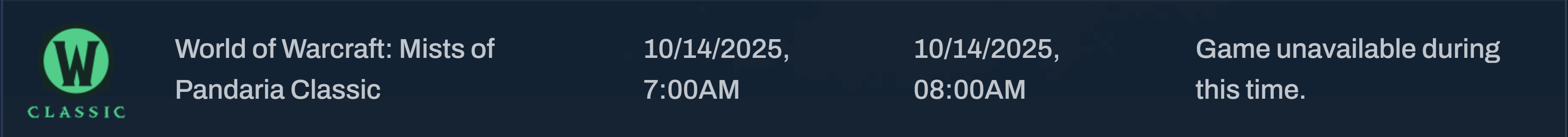 All Mists of Pandaria WoW realms will undergo 1-hour maintenance this week, with no new content being added to the game.