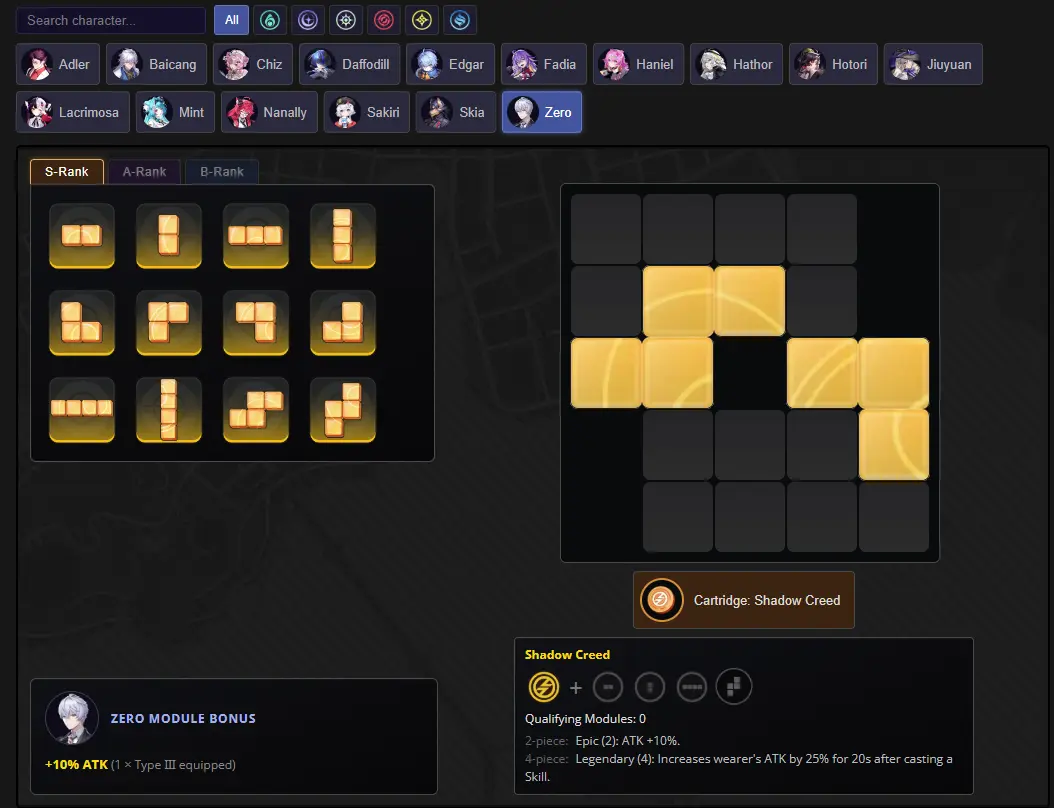 Each character also has their own Console layout and Tetris-style passive, and those basically reward how you place pieces. On top of that, set bonuses require specific combinations of pieces, you cannot just stack one type for broken stats, and optimization comes from smart placement, not RNG