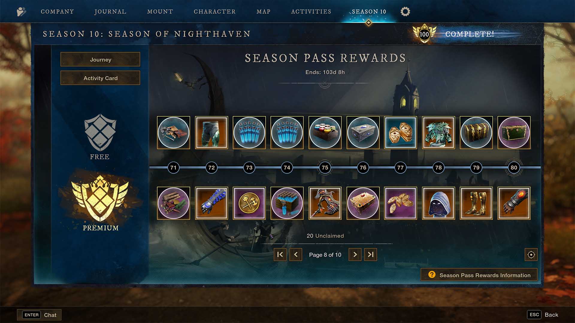 Every season of New World: Aeternum comes with its own unique season rewards track. Within this rewards track there is a “free” track, which is available to all players. There’s also a “premium” track which costs 20,000 marks of fortune to unlock. This “premium” track typically includes a handful of additional transmog-specific items and doesn’t include items that would lead to any form of “pay-to-win” approach.