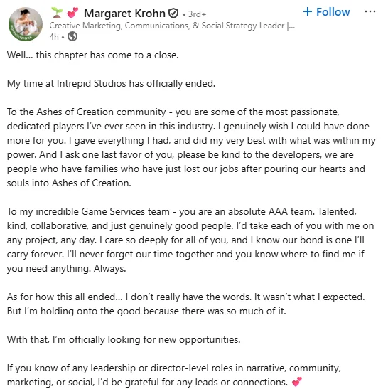 The first action that was noticed by the Ashes of Creation community was the posting of multiple LinkedIn posts from a handful of Intrepid Studios employees. These posts highlighted their experience with Intrepid Studios, and a mention that they are now actively looking for new job opportunities. Additionally, most of these individuals updated their LinkedIn profile images with the green “open to work” banner.