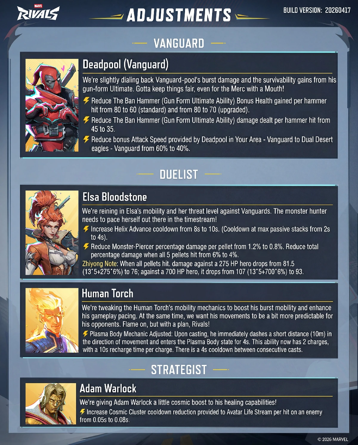 For Duelist Elsa Bloodstone is getting a lot of nerfs, but some fans believe that this won’t impact her power at all. Whereas Human Torch’s mobility is being changed. Now, Plasma Body will have a short dash before the speed boost kicks in, which is now on a charge system, rather than a meter.