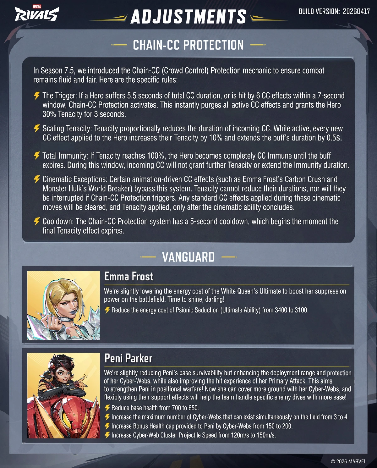 For tanks, there aren’t many adjustments; more tweaks are being made to the Chain-CC Protection system, recently introduced to Marvel Rivals.