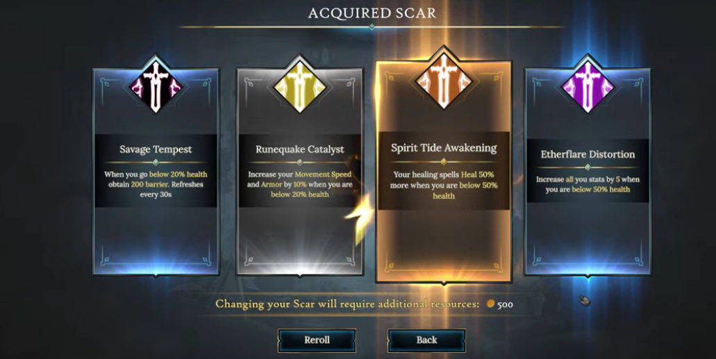 Please note: There is also an option to reroll your Scar options, but there’s a cost associated with doing so. Plus, it doesn’t guarantee that the new Scar options are any better!