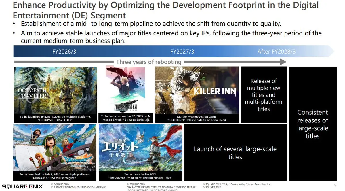 After a few rough years filled with underperforming releases and too many short-term projects, Square Enix says it is now in the middle of a “three-year reboot” aimed at getting back on track. The main goals are: