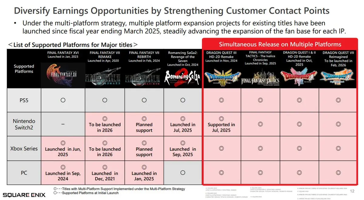 The most exciting part of Square Enix’s briefing might just be its new multi-platform plan. The company shared a chart outlining how it plans to release all future games simultaneously across PS5, Xbox Series, PC, and Nintendo Switch 2.