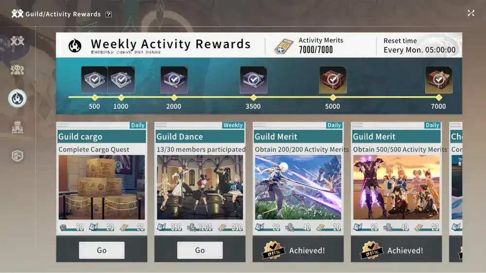 At the core of the system are Weekly Activity Rewards. Hitting the weekly activity cap earns every member Star Chests, 100 Bound Rose Orbs, Bound Luno, and Guild Tokens. This is a special currency you can spend in the Guild Shop on valuable items and materials.
