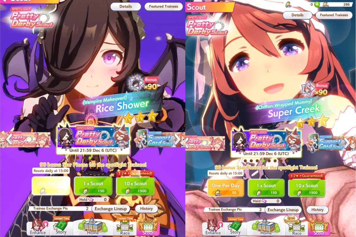 The Halloween Makeover’s Trainee banner features [Vampire Makeover] Rice Shower and [Chiffon-Wrapped Mummy] Super Creek.
