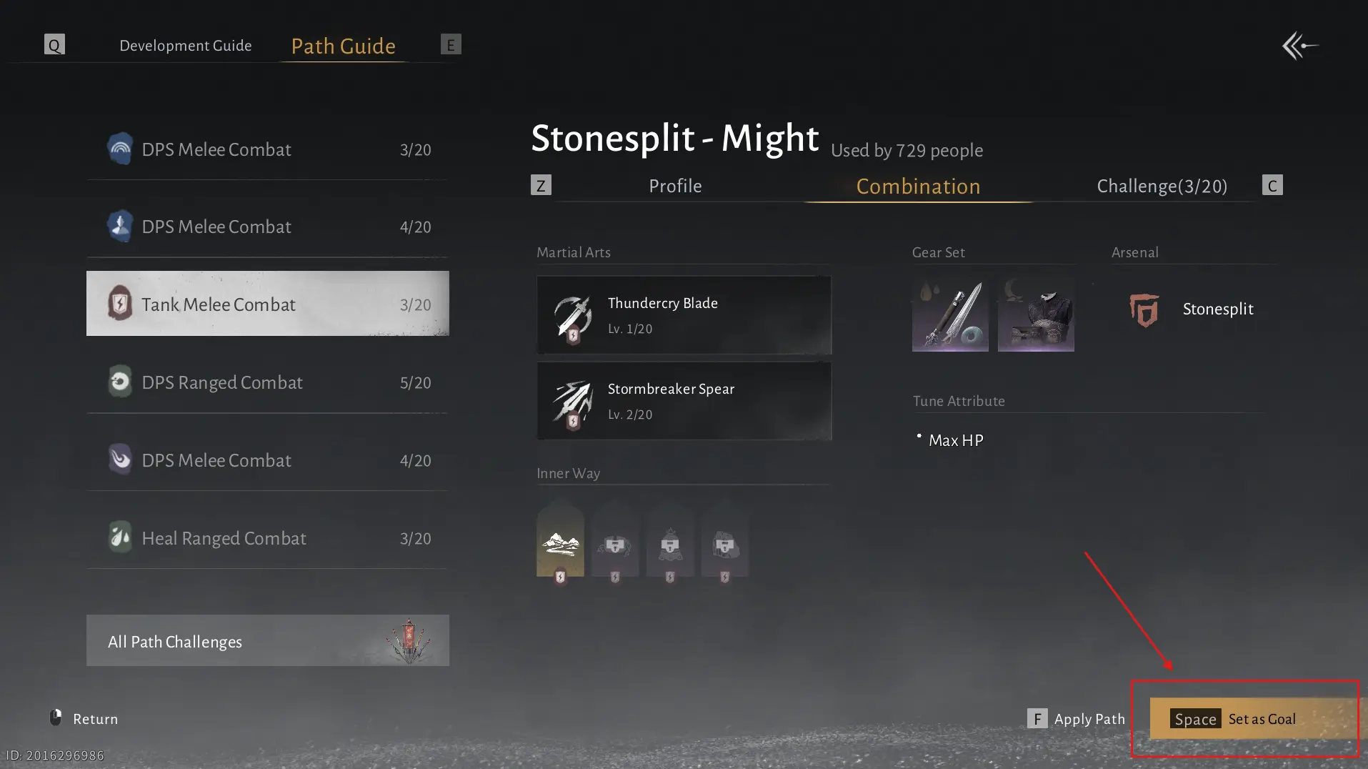 For example, the Tank Melee Combat “Stonesplit-Might” build recommends the Thundercry Blade and Stormbreaker Spear, alongside four Inner Ways that synergize perfectly with that playstyle. Once you have decided which build you want, you can use the Set as Goal feature: