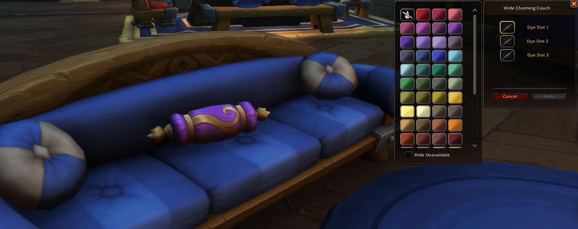 Dyes are obtainable through the Auction House, or as a result of Inscription and Alchemy both; Scribes mill the pigment, while Alchemists create the Dyes themselves. Most items have several different zones that can be dyed, and the options look to be just as expansive as the rest of the decor system!