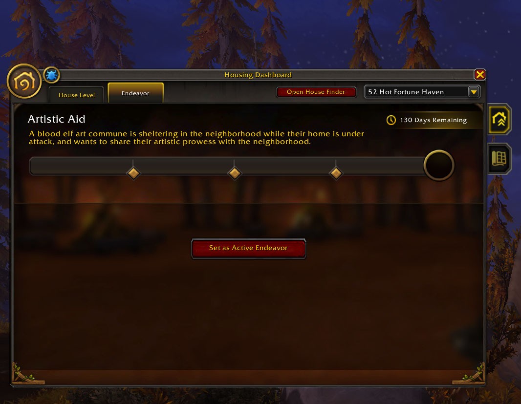 When a new Endeavor begins, your Neighborhood will itself change to match the theme as new neighborhood decor, vendors, NPCs, and questgivers file in. Each Endeavor is active for a month, giving Neighborhoods plenty of time to reach all their milestones!