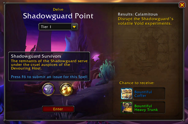 When you approach the entrance to a Delve, you will be greeted by a special User Interface window that provides important information to prepare you for your run.
