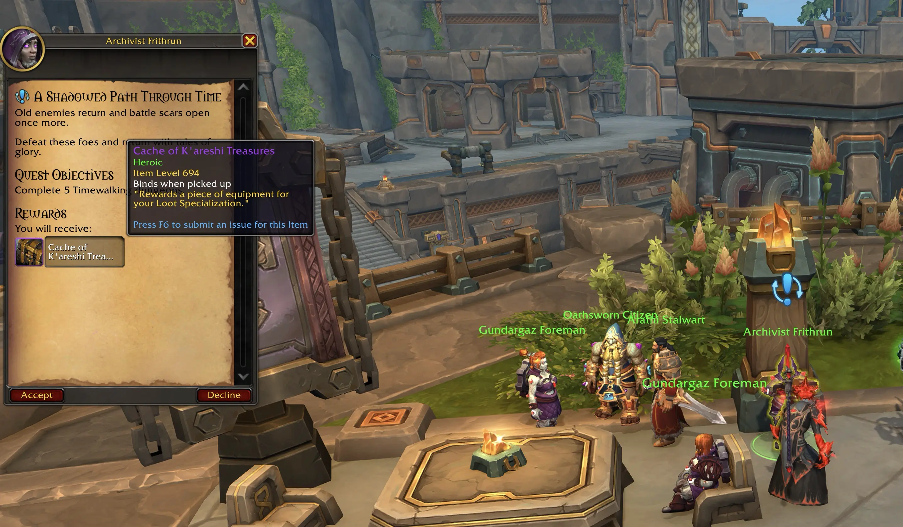 Every week, completing just 5 Timewalking dungeons will earn you a Heroic raid cache with ilvl 694+ loot, so don’t forget to pick it up at Archivist Frithrun in Dornogal.