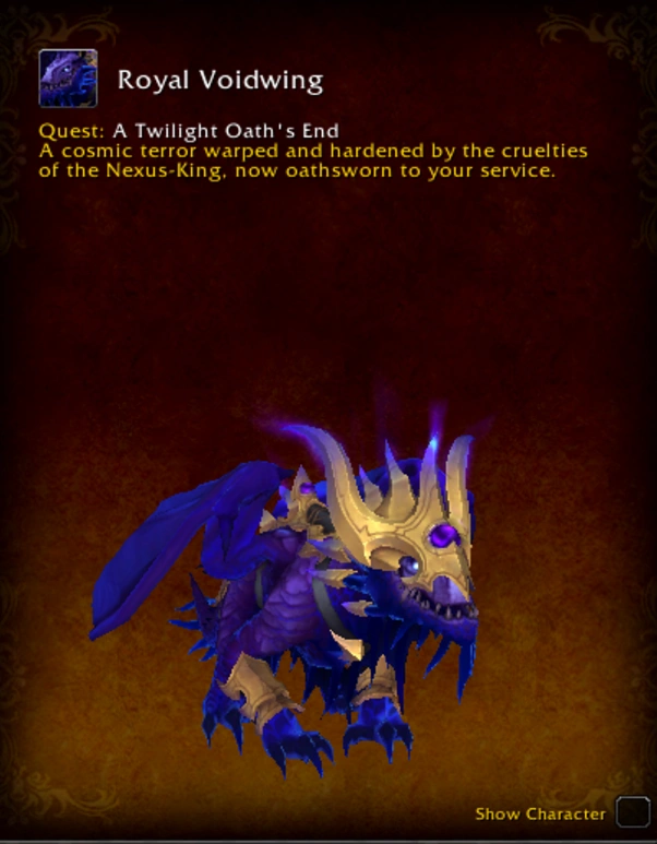 Royal Voidwing mount if you kill him on heroic, which is going away with the launch of Midnight.