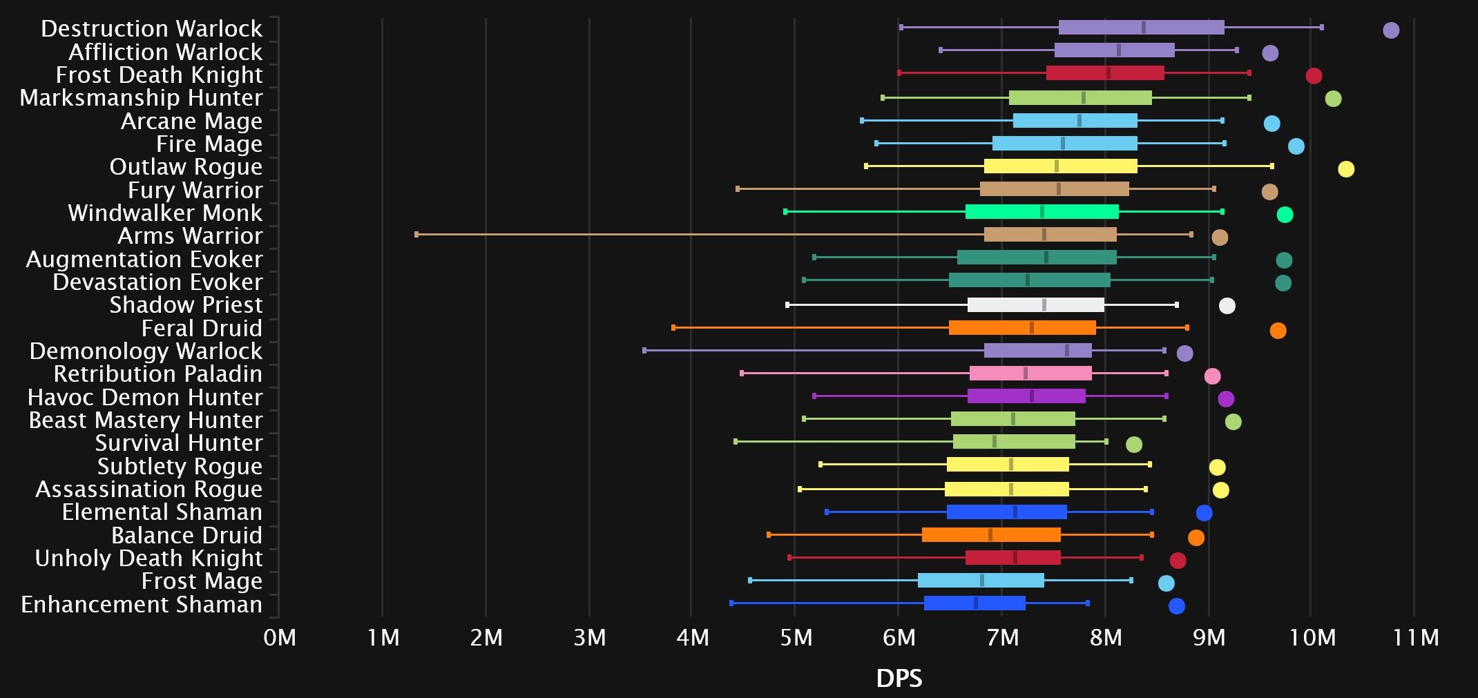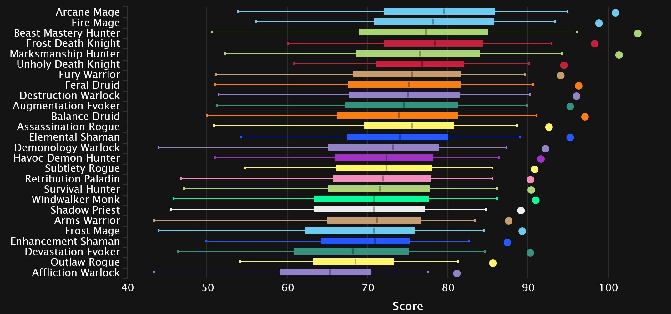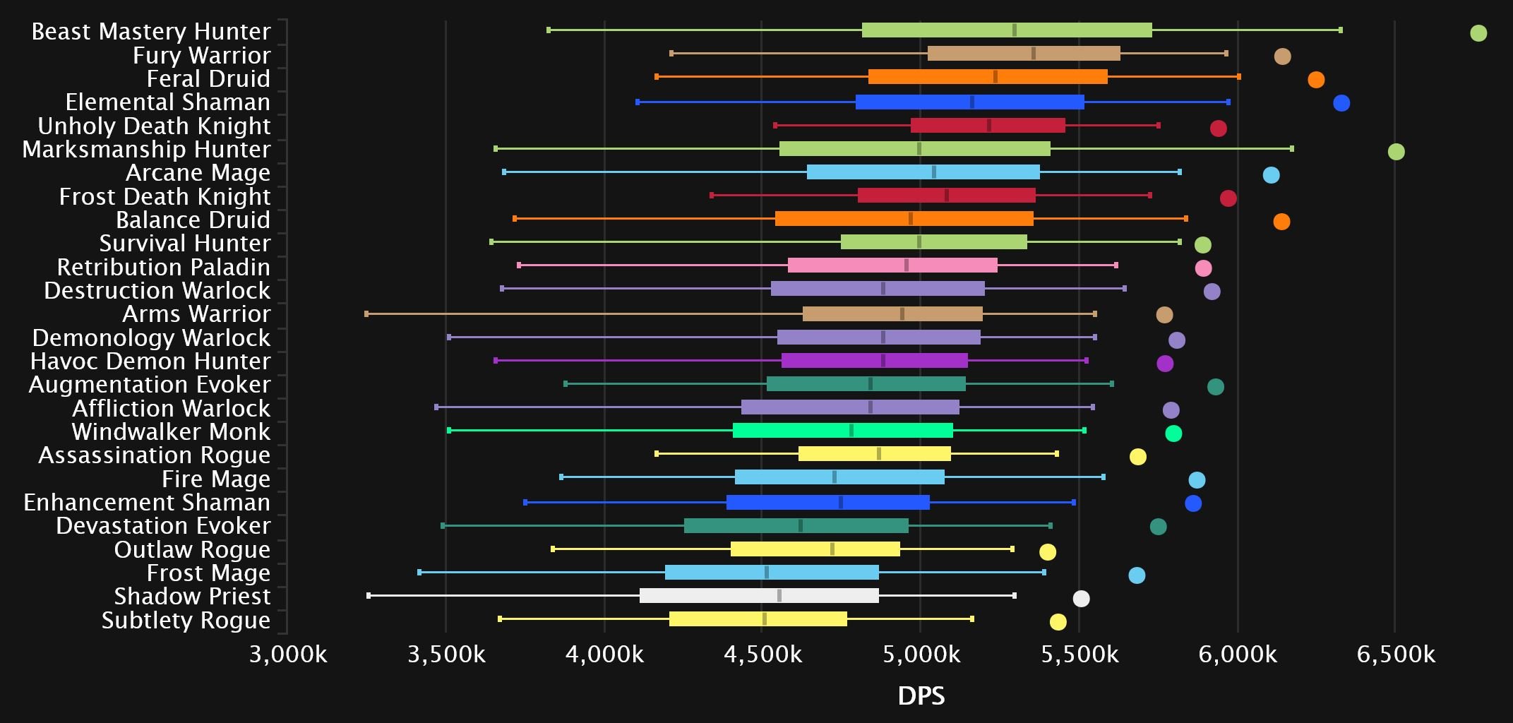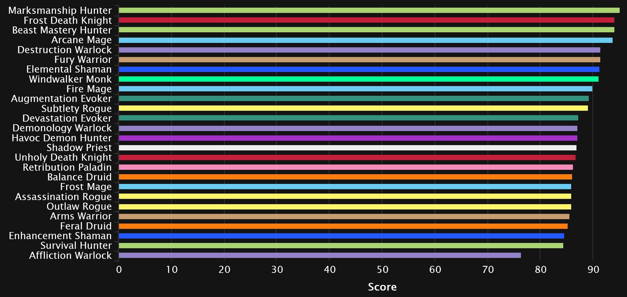 Windwalker and Fire switch spots as the Monk comes out on top in 8th, while Augmentation continues its rise and makes it into the top 10! Affliction is suffering from Dimensius syndrome, as the spec’s performance on the final boss tanks its overall rating. And while it’s not quite as bad as Unholy’s 0 DPS boosted char we’ve seen the last few weeks, it’s still enough to drag it down to dead last. Survival joins Enhancement in the bottom 3 this time, as Outlaw pulls itself out for now.