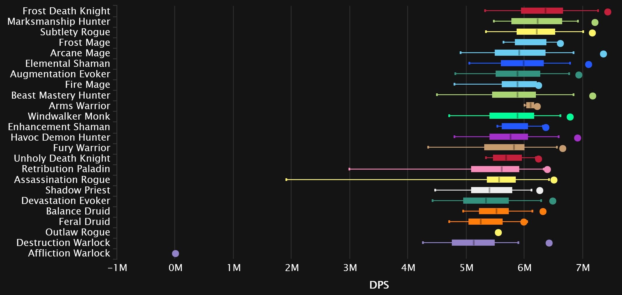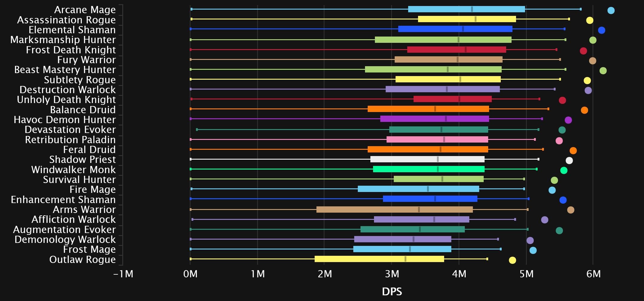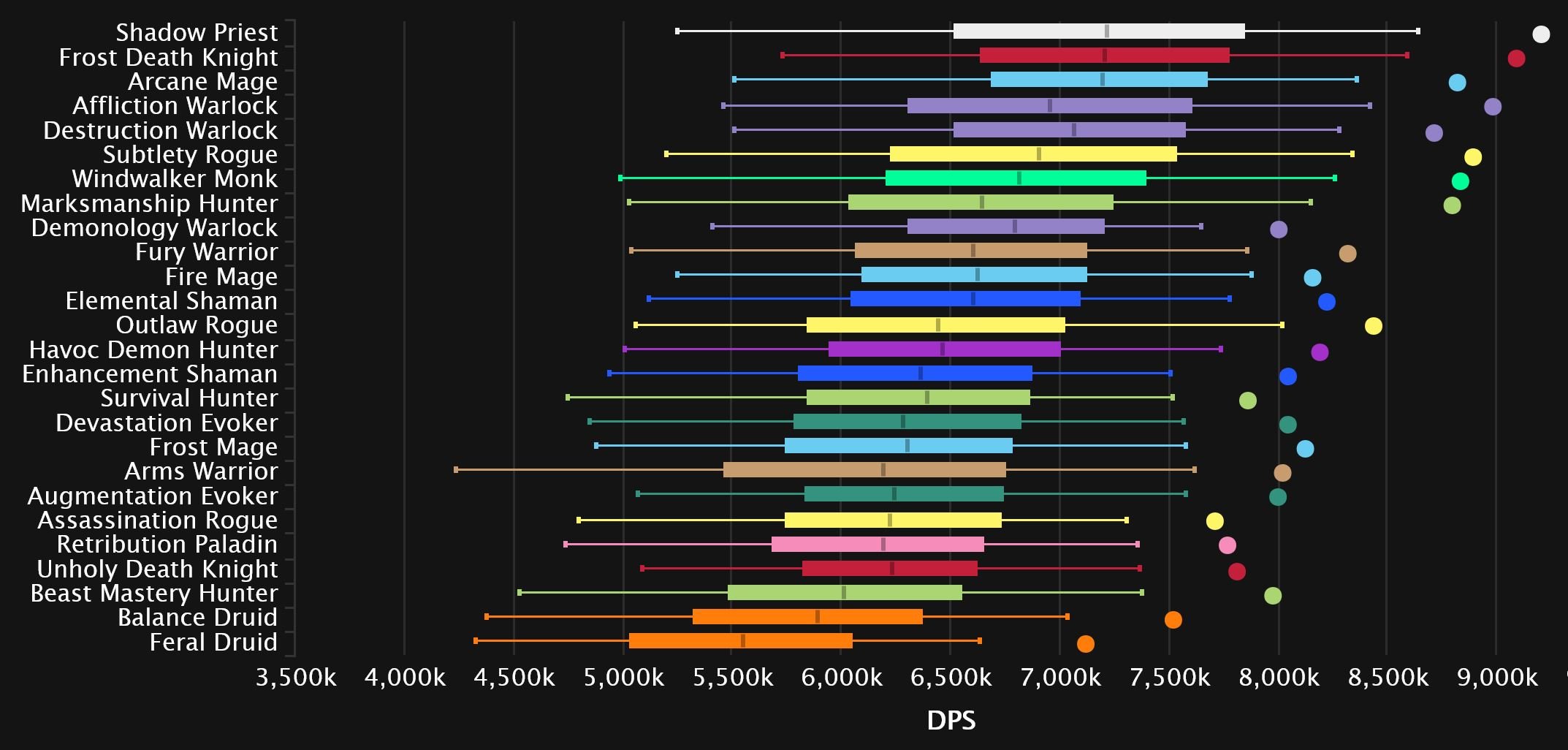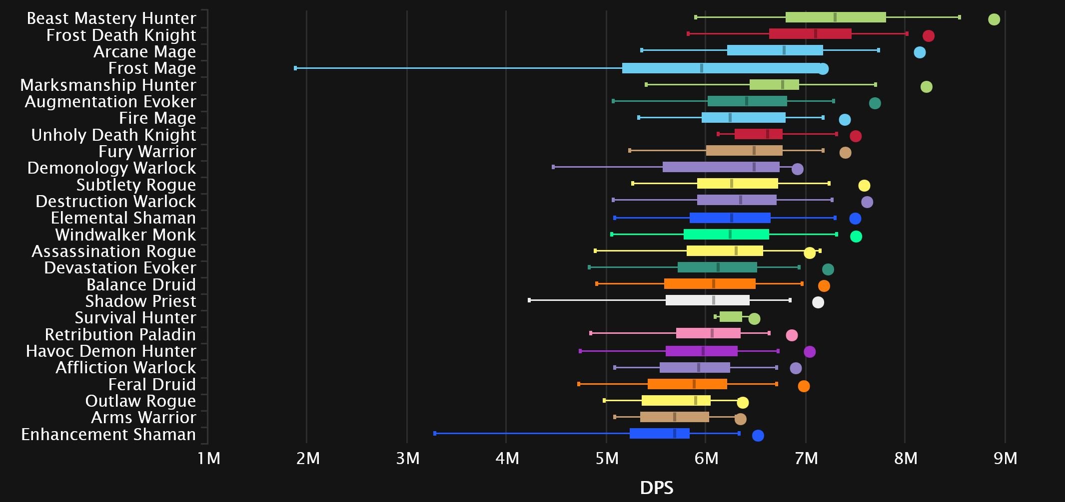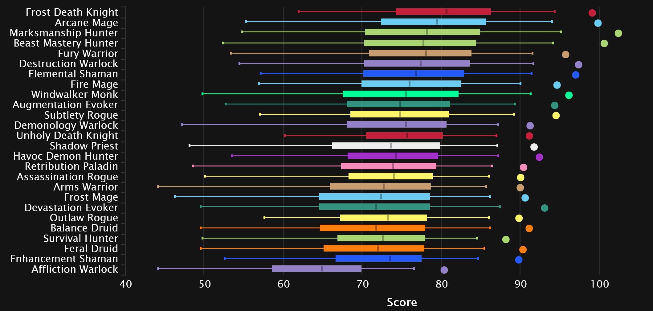 Windwalker and Fire switch spots as the Monk comes out on top in 8th, while Augmentation continues its rise and makes it into the top 10! Affliction is suffering from Dimensius syndrome, as the spec’s performance on the final boss tanks its overall rating. And while it’s not quite as bad as Unholy’s 0 DPS boosted char we’ve seen the last few weeks, it’s still enough to drag it down to dead last. Survival joins Enhancement in the bottom 3 this time, as Outlaw pulls itself out for now.
