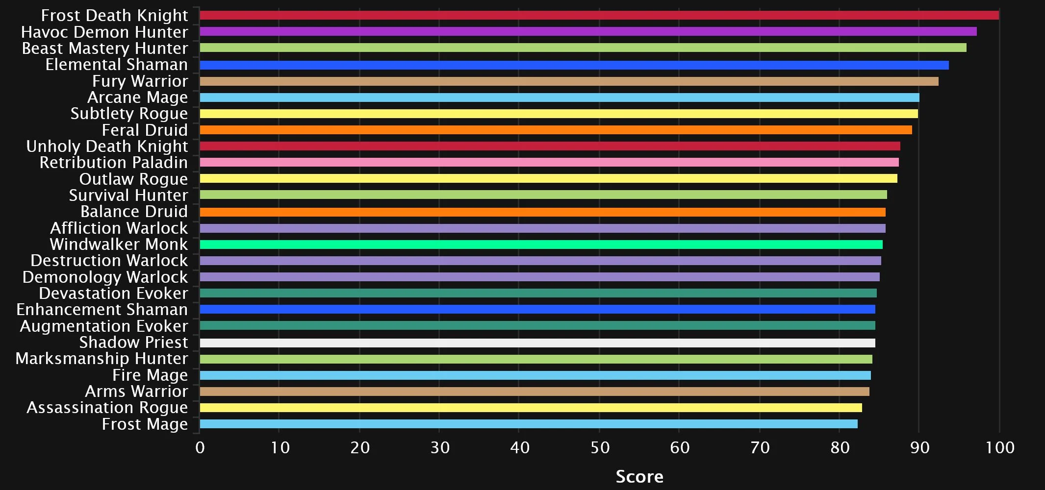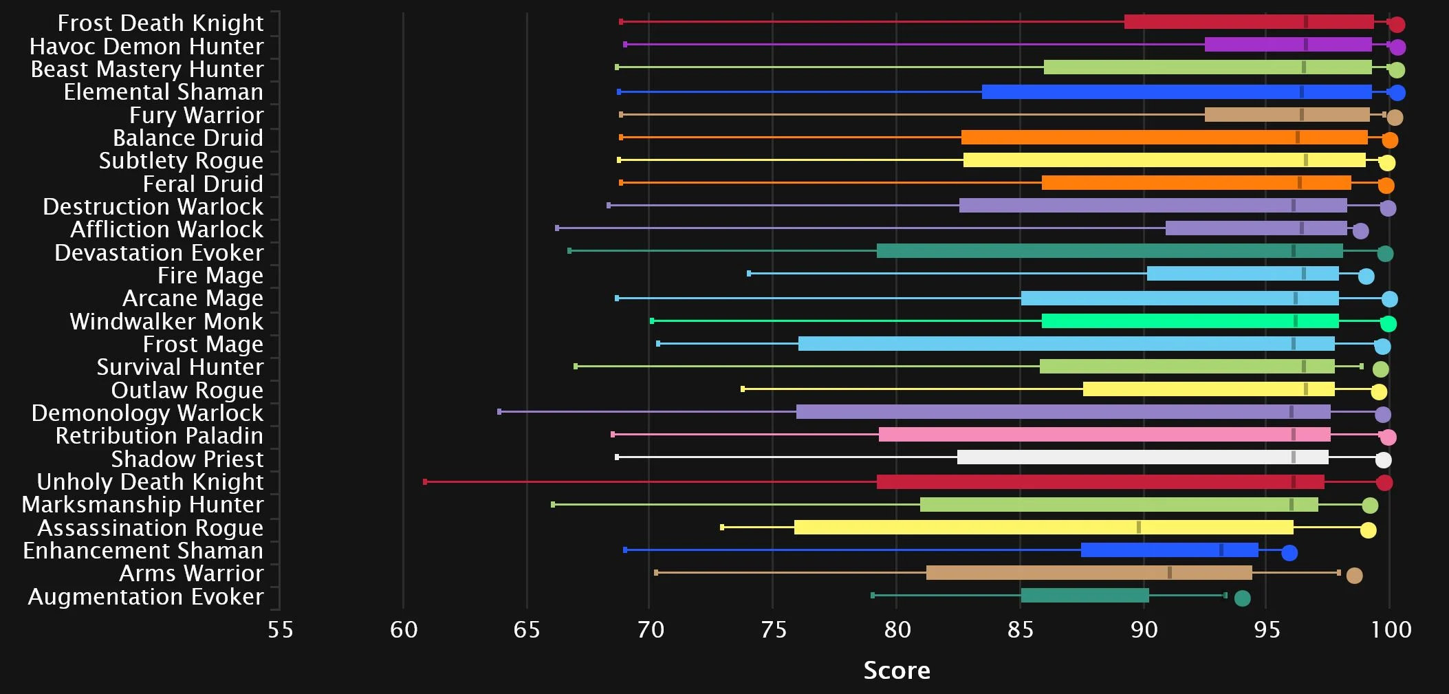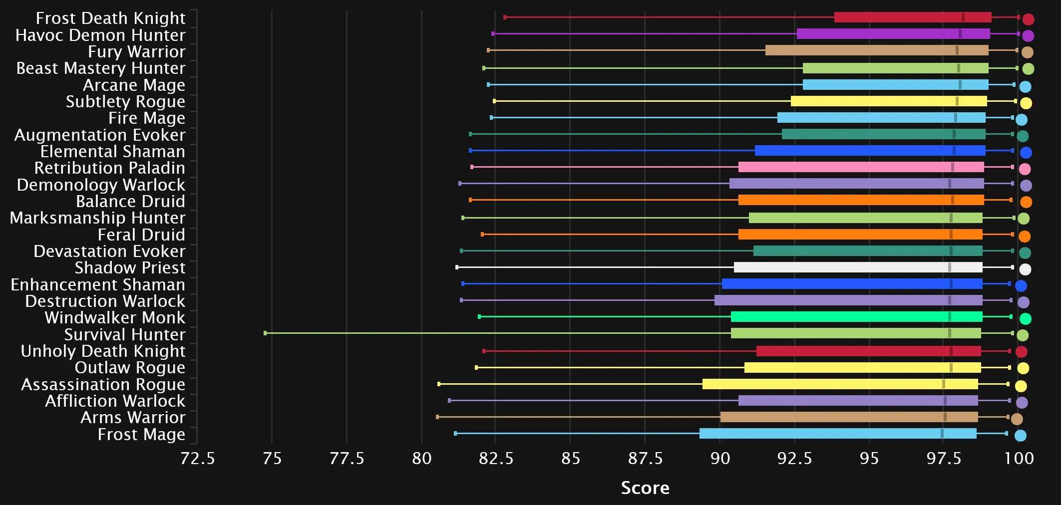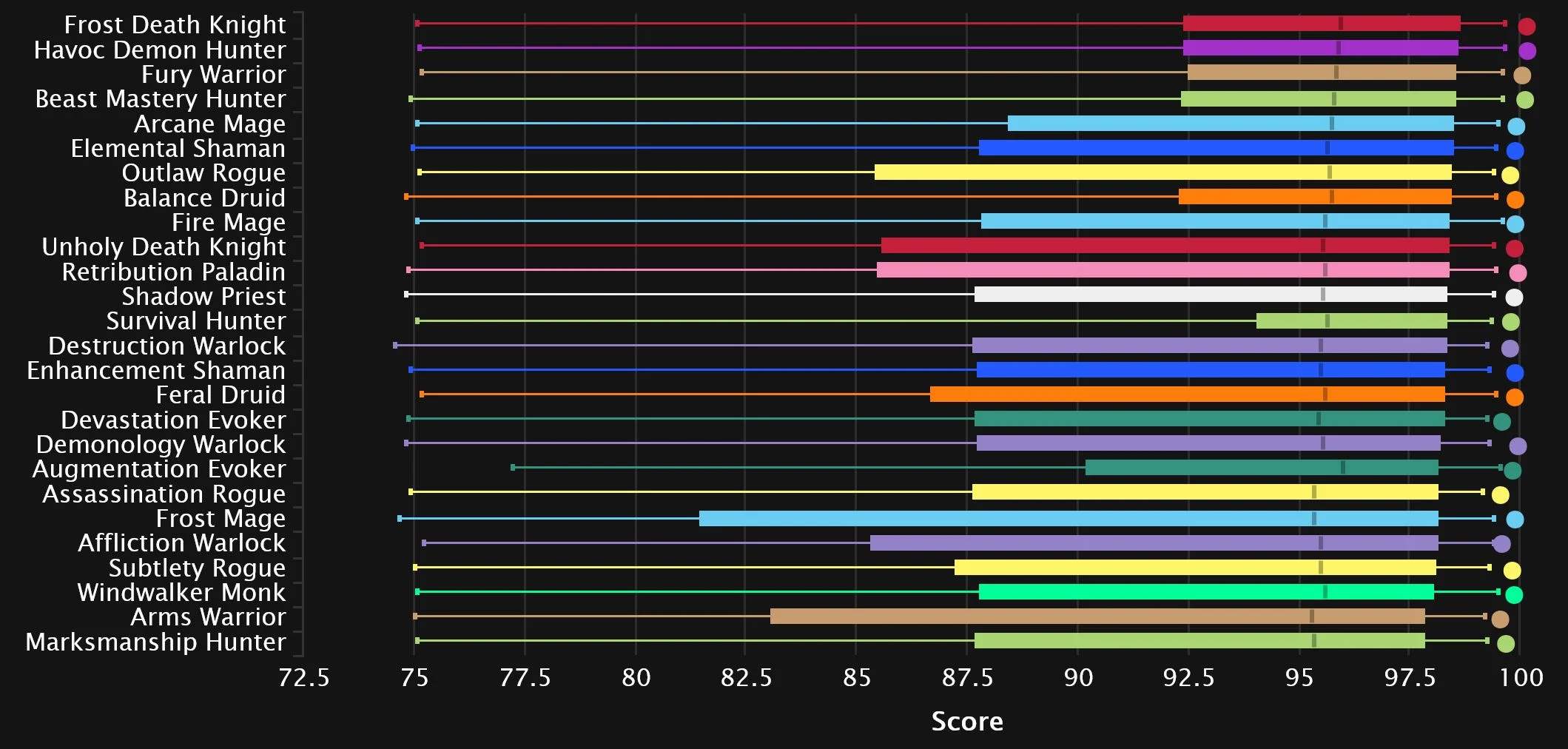 Note: We are using normalized scores instead of raw DPS for the Warcraft Logs rankings. Normalized scores take into account the outlier boss fights where certain specs could stack massive DPS (due to the nature of the fight, whether it’s AoE spam or something else), which would then affect their overall score for the whole raid.