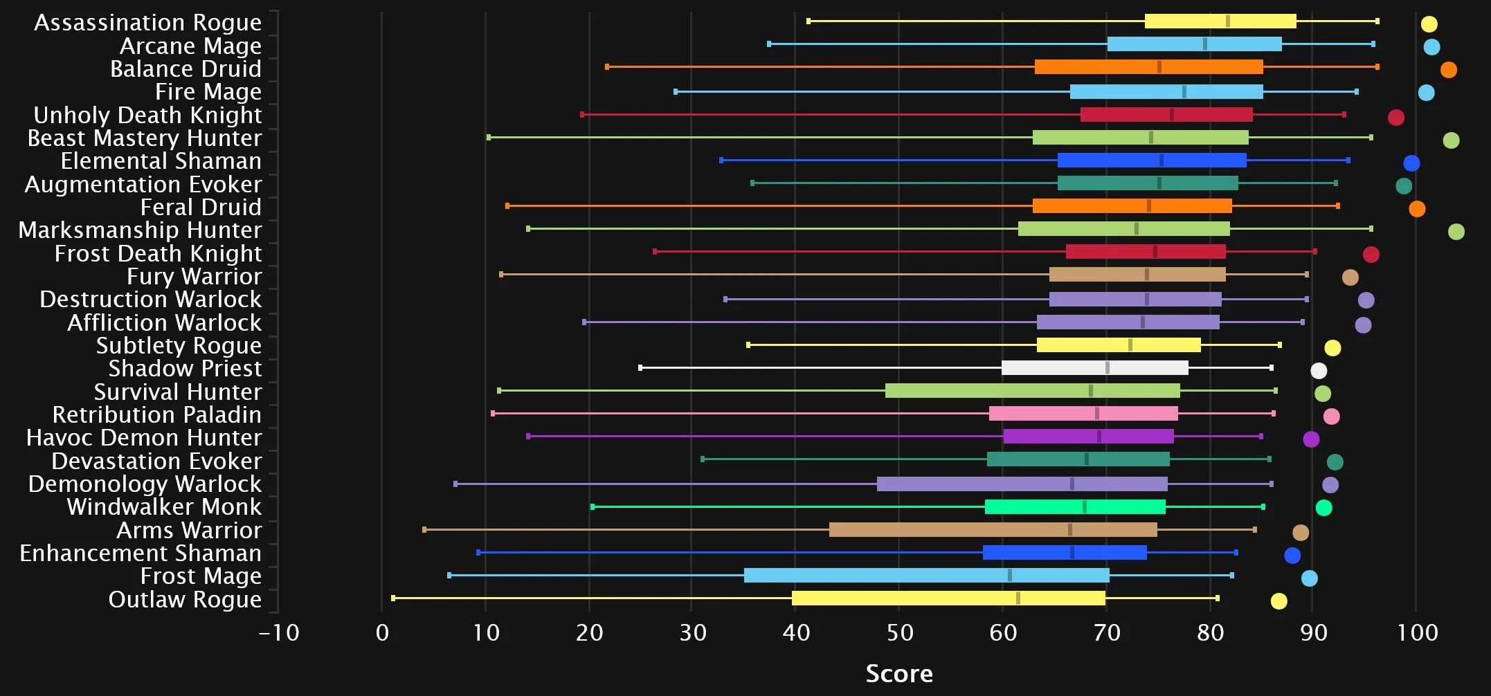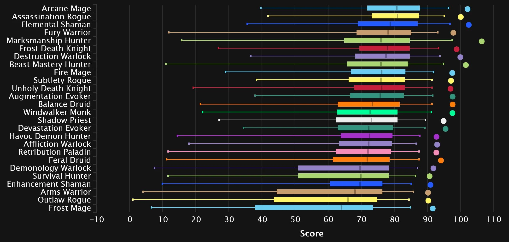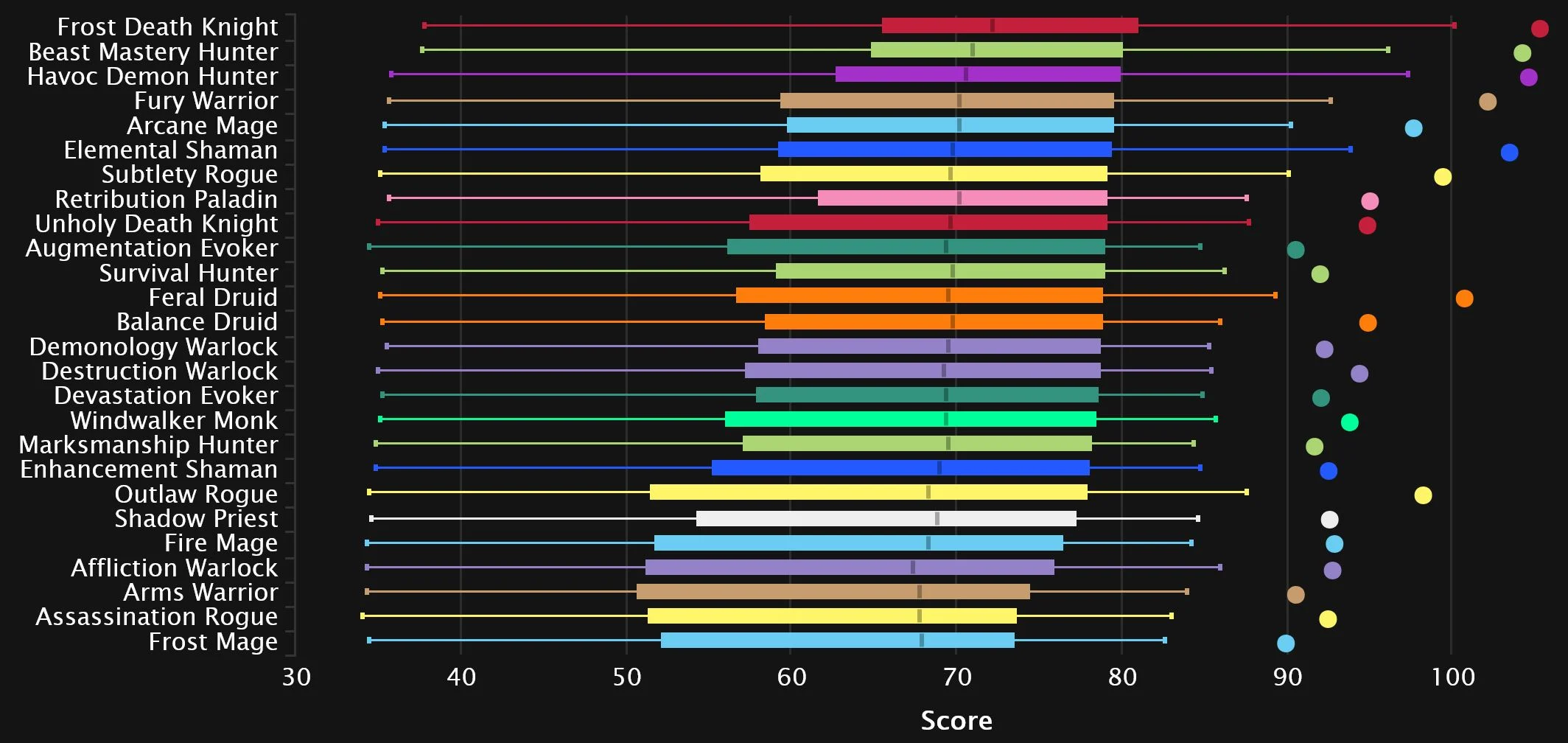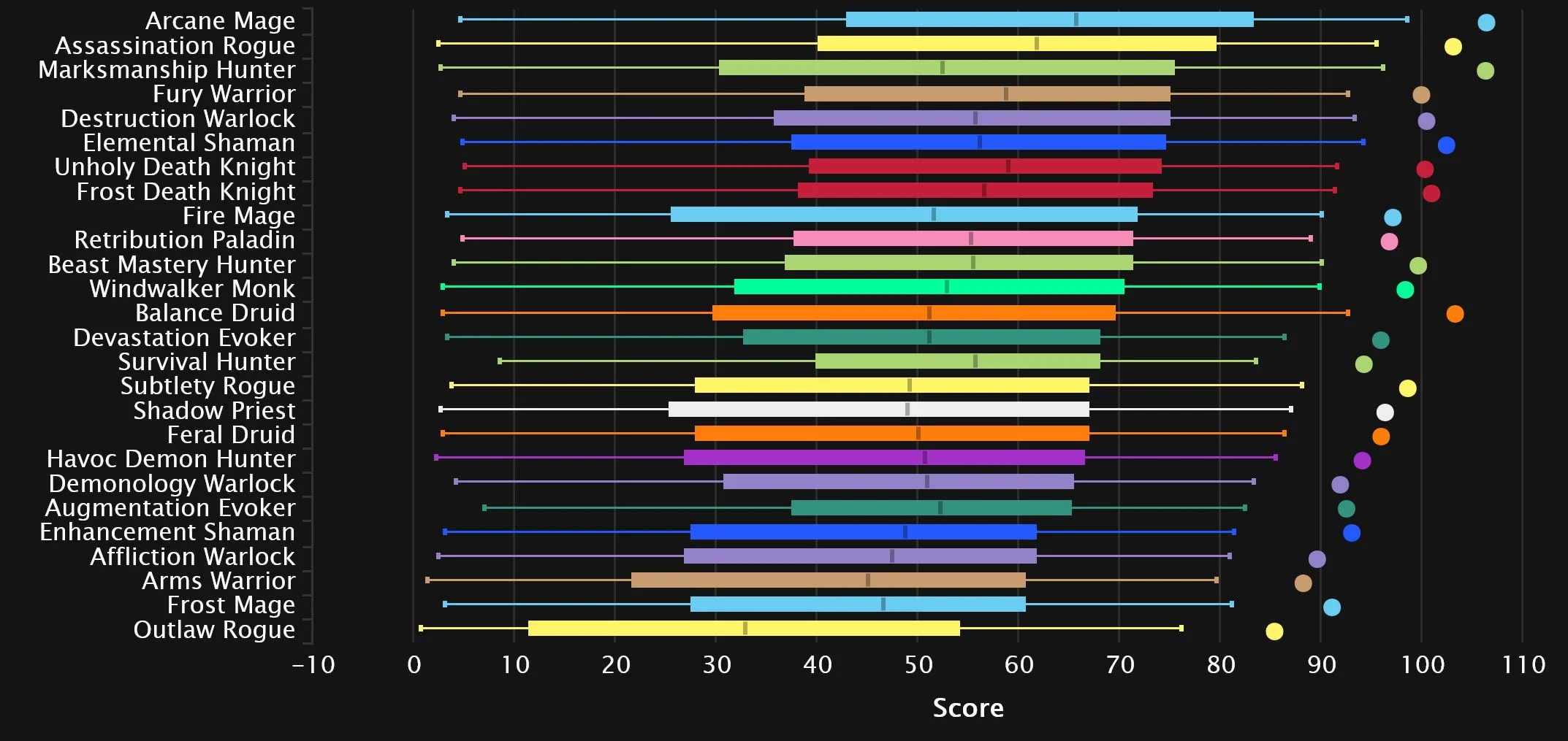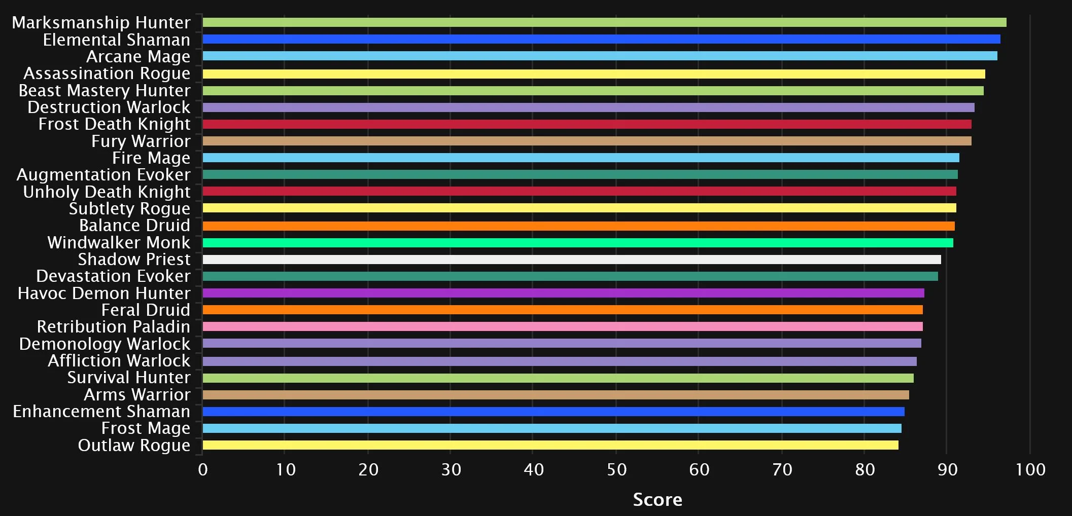 Note: We are using normalized scores instead of raw DPS for the Warcraft Logs rankings. Normalized scores take into account the outlier boss fights where certain specs could stack massive DPS (due to the nature of the fight, whether it’s AoE spam or something else), which would then affect their overall score for the whole raid.