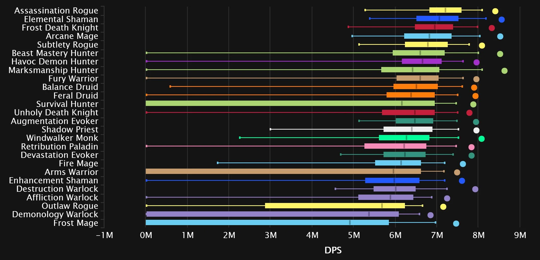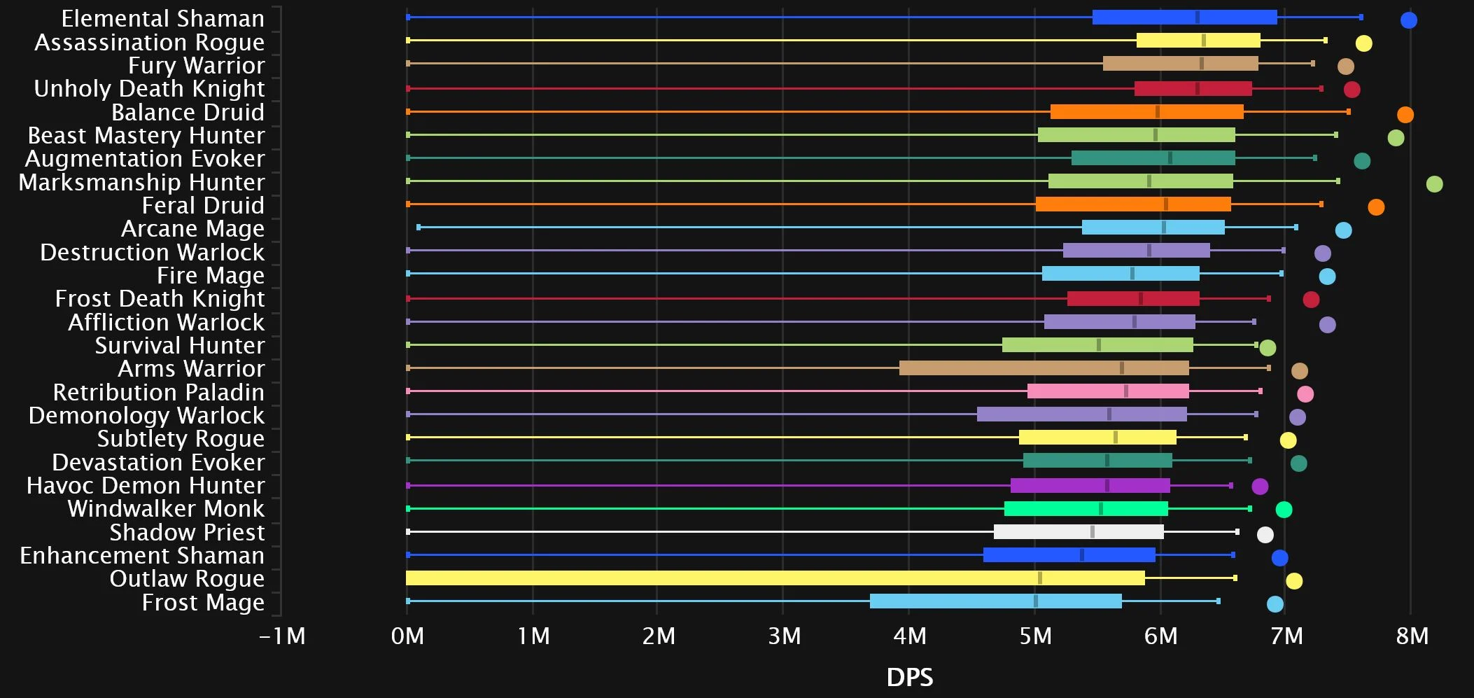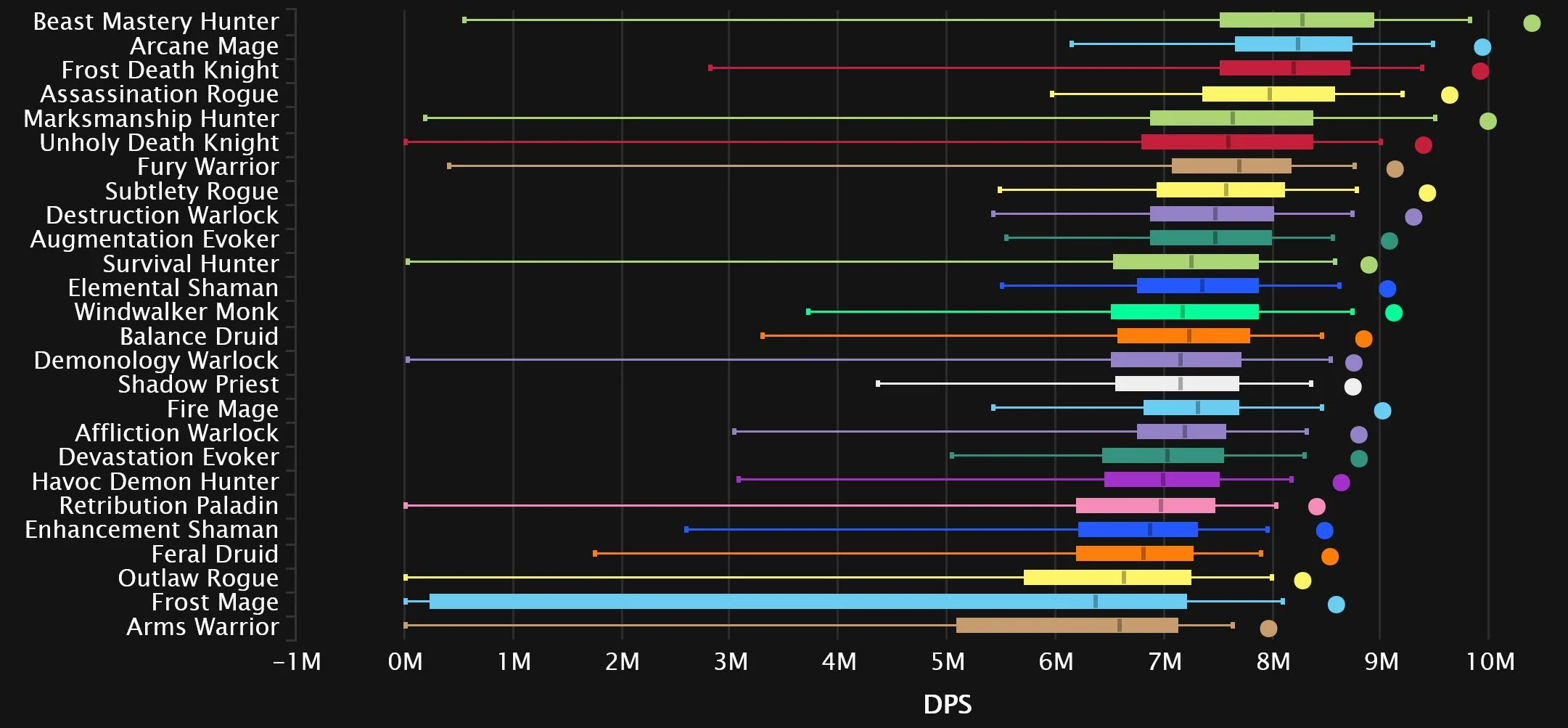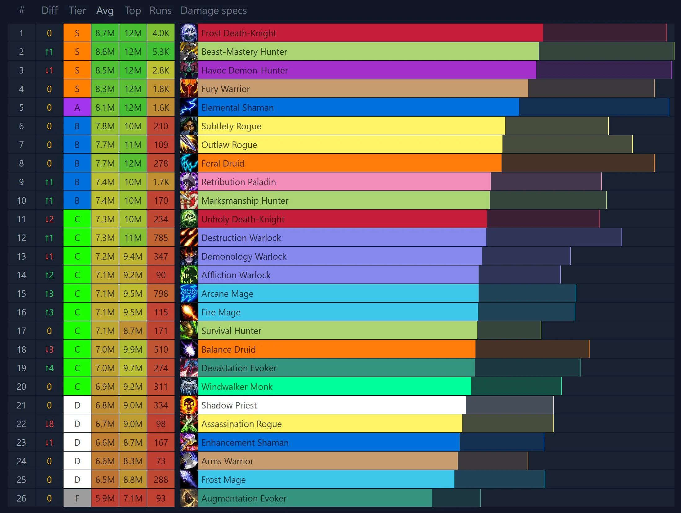 Note: We’re also taking a look at the raw damage numbers from Mythicstats. They take the top runs for extremely high keys (+14-22) from WarcraftLogs and list the overall DPS for the dungeon, which includes non-combat time as well. They’re ranked by the average DPS numbers, with the very top of the top shown next to it.