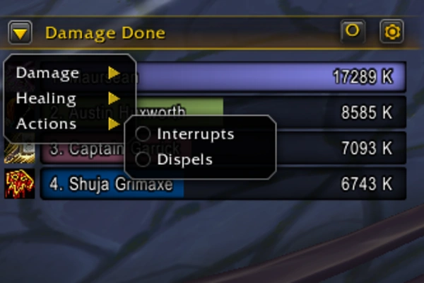 - Current categories include: Damage Done, DPS, Damage Taken, Healing Done, HPS, Interrupts, Dispels.