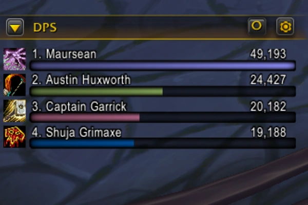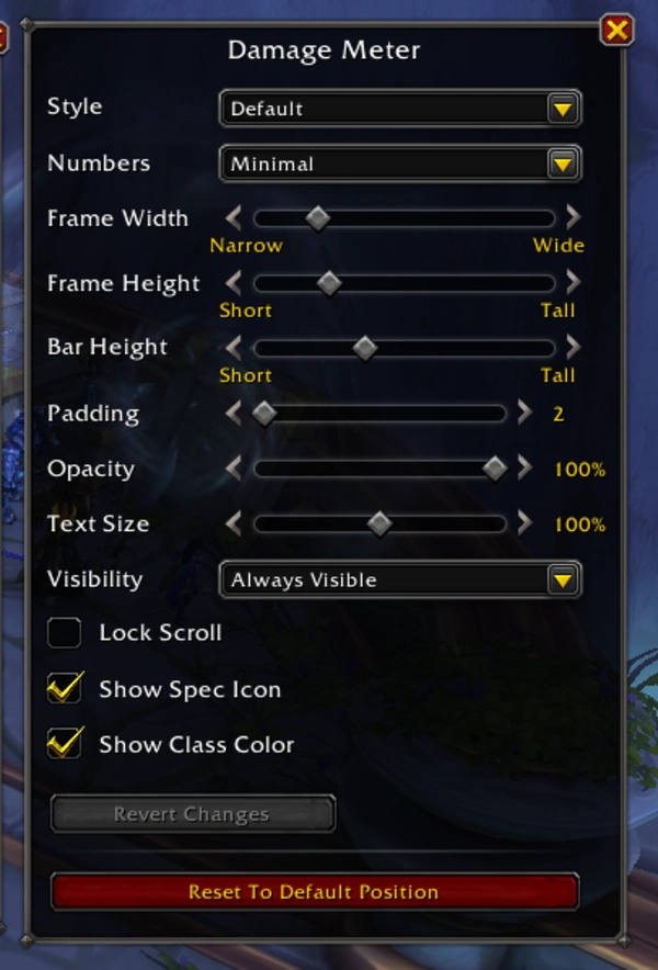 The damage meters are fully customizable in Edit Mode, and can be placed anywhere you want for convenience. There are two different styles available, Default and Thin. From there, you can adjust the height and width of the frame, bar height, opacity, when you want the meter visible, and even add class colors and spec icons to the bars.