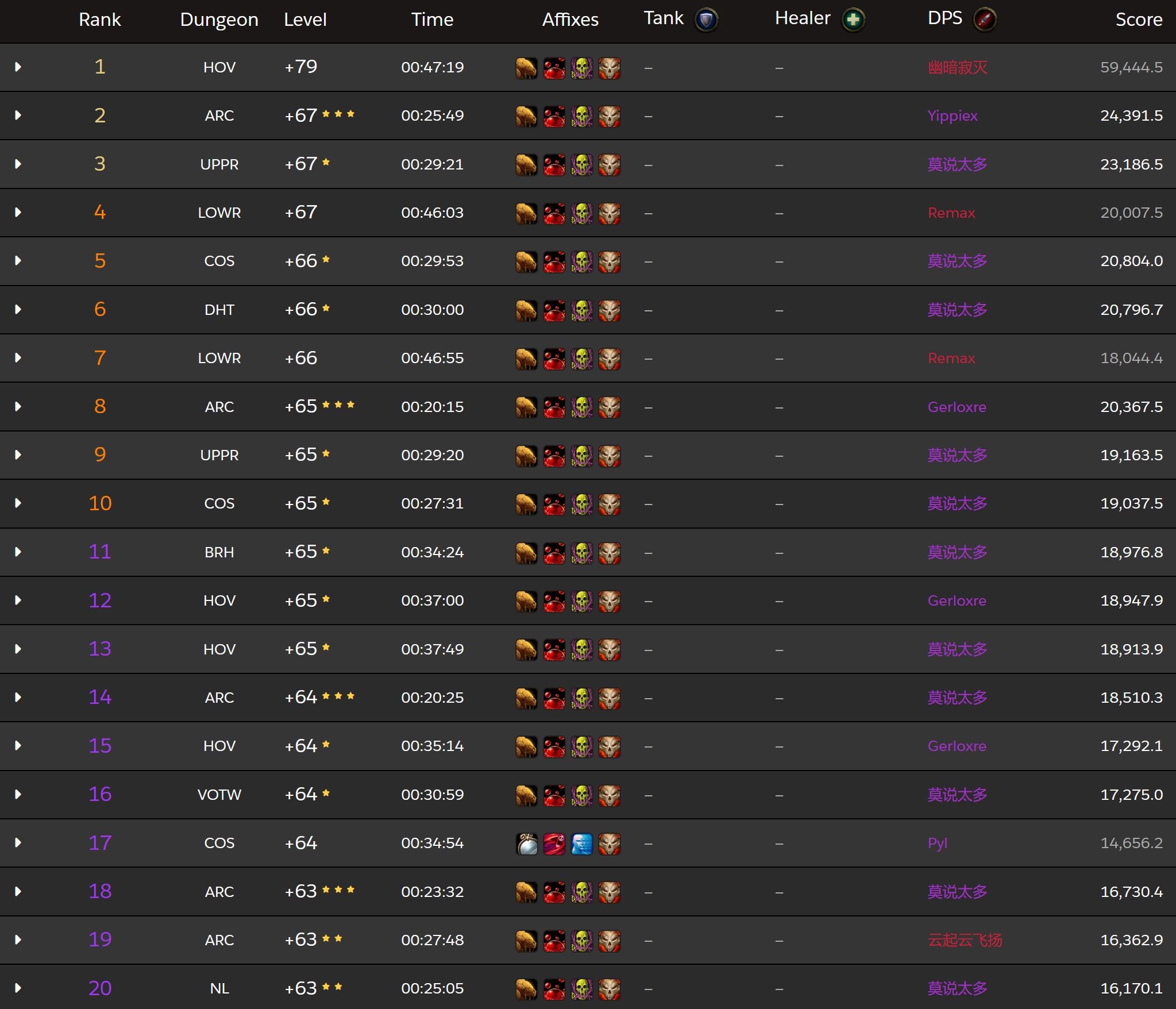 The second is significantly higher. And despite not being in time, it’s not that far off considering the giant leap in key number. 幽暗寂灭 managed to get within 9 minutes of completing a +79 Halls of Valor! Unfortunately, we don’t have any specific data on the run, aside from it being an Unholy Death Knight.