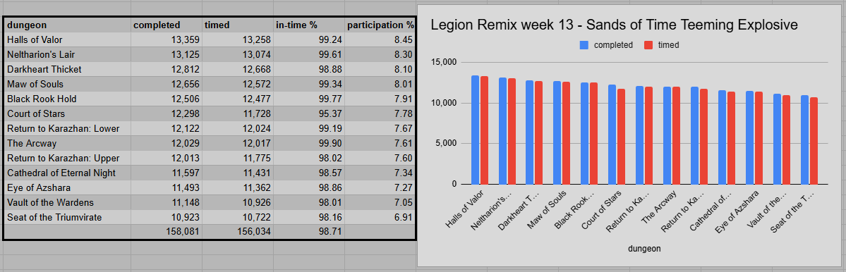 The split across all dungeons, as well as the success rates, stayed almost untouched in week 13. It remains surprising that Court of Stars grew more popular over time, despite having the worst success rate. Maybe the quick access from Dalaran is boosting those numbers.
