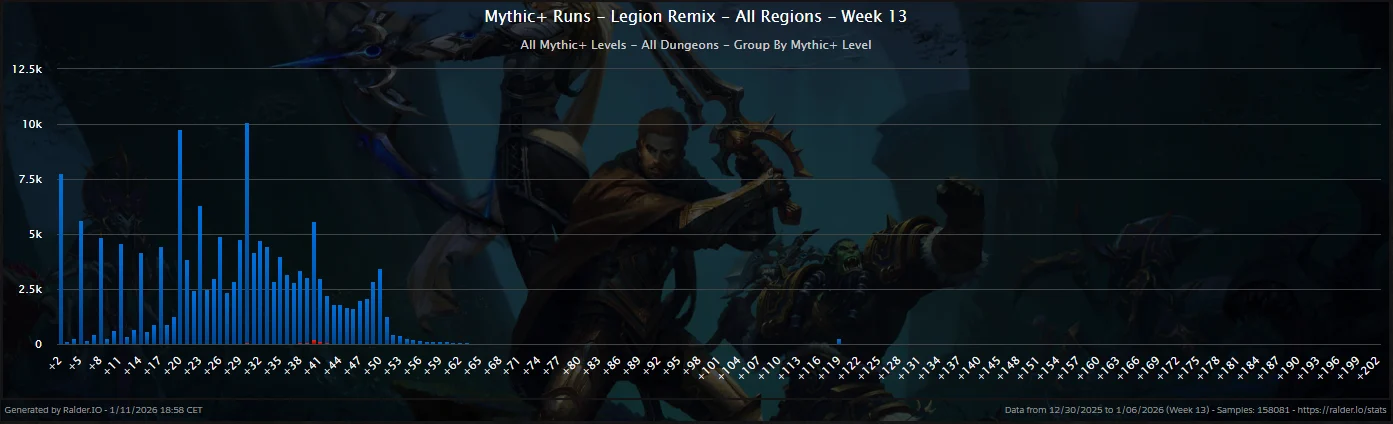 Retail M+ remains stable at its seasonal floor as players gravitate toward seasonal reward goals. On Remix, this pattern also emerges despite a continuous decline overall. The MDI record of level 24 has not been replicated on Retail, and level 23 may remain the seasonal cap.