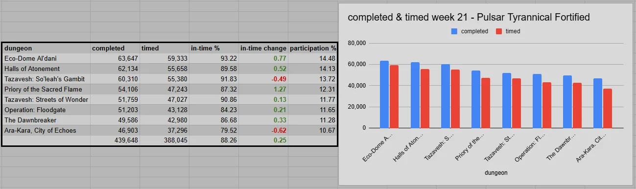 The dungeon split was nearly unchanged from the previous week. Halls of Attonement and Gambit have changed positions. The success rate (88.26%) also improved slightly by 0.25 percentage points. This may be due to the affix change. A shift toward lower, easier key levels during a dungeon event week can also boost this value.