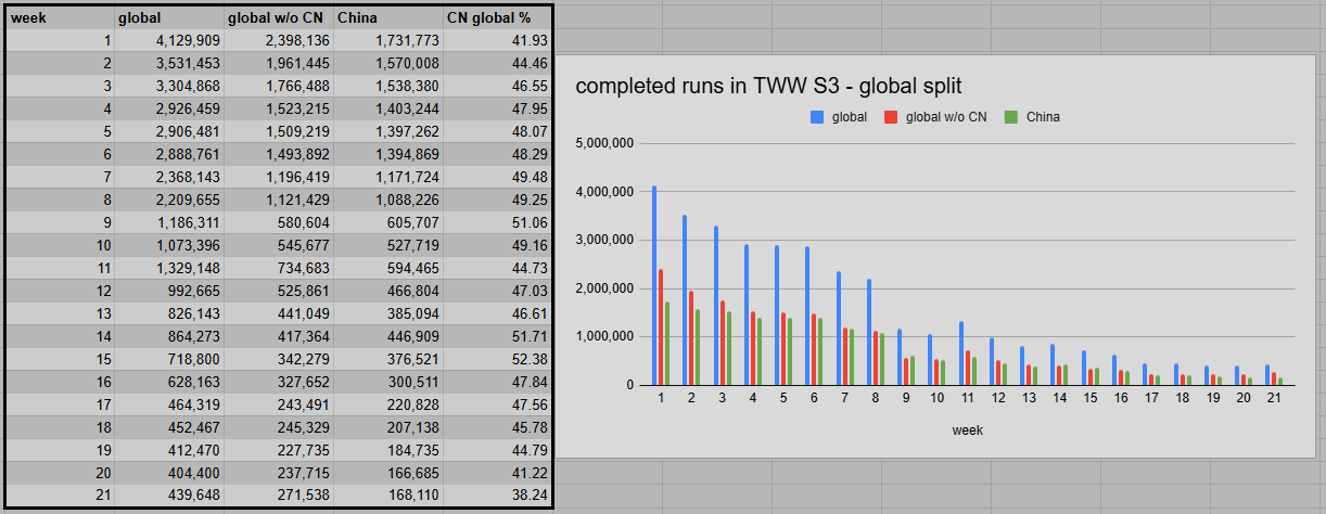The trend on Remix is similar. While global numbers are no longer dropping as sharply, Chinese metrics are also at an all-time low. Compared to the previous week, Remix M+ lost another 19.52%. The US is by now the most dominant region. Those players still appear to have many unfinished reward objectives.
