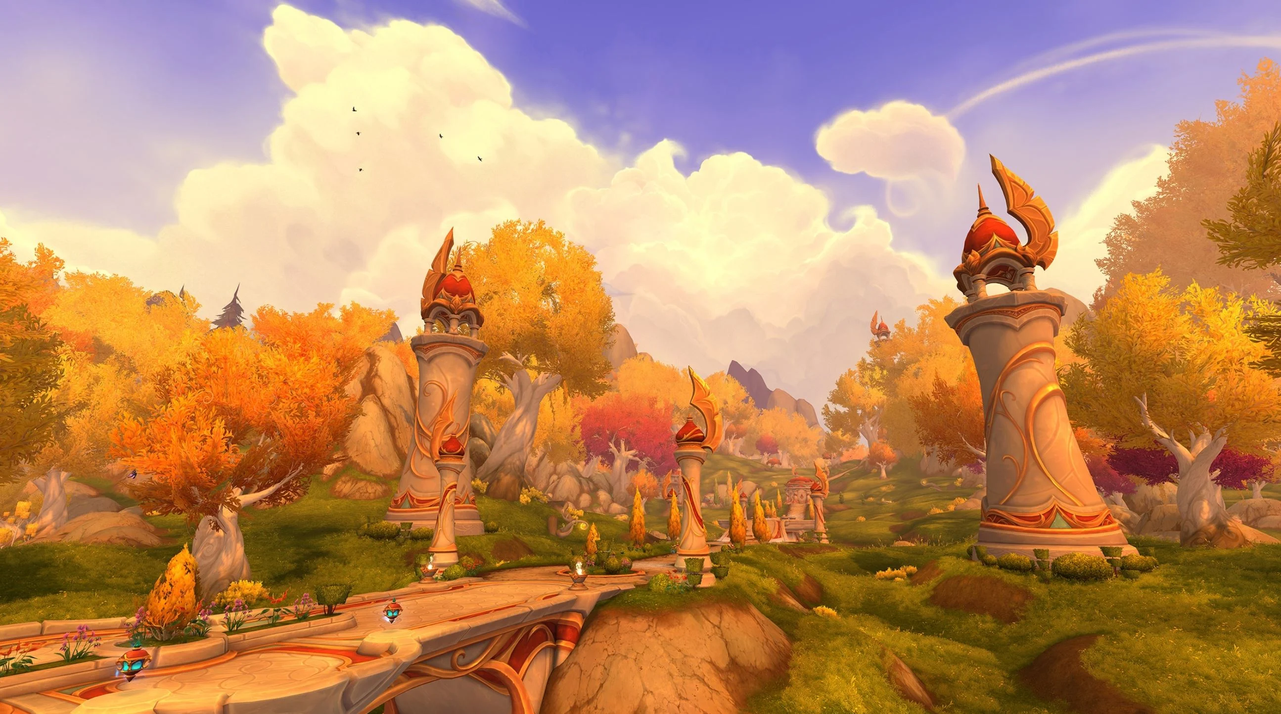 Players can take to the skies and Skyride through the zone, without loading screens, while experiencing the majesty of the glittering spires of blood elf architecture and golden foliage of the forests from above.