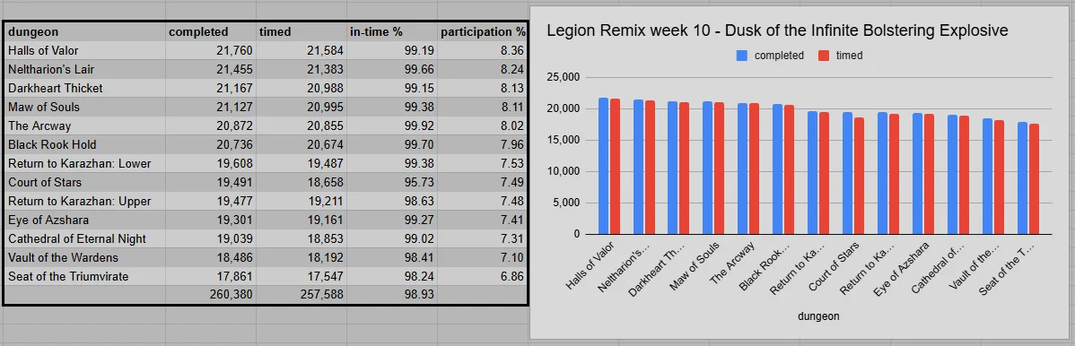 The split across all dungeons decreased a bit in week 10. This might be a reflection of a general interest in just running M+ without being picky about the dungeon. The order also shuffled a bit, given the rather small gaps in total runs. And Court of Stars was not dead last, despite still producing the worst success rate with 4.27% depletion. Maybe affixes turn this instance into a struggle. Or groups that underestimate pulling the second boss without separating the adds walk into a certain wipe here and there.